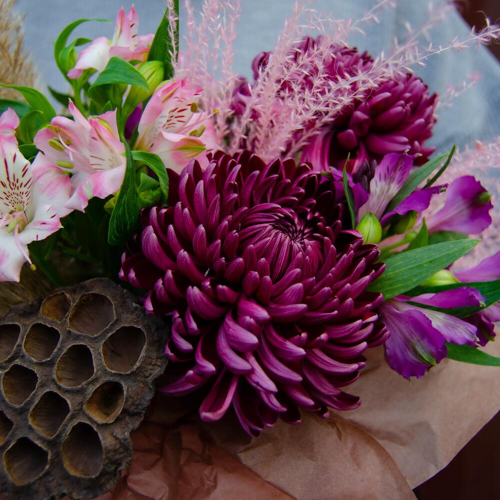Альстромерия - 3 шт. Лотос - 1 шт. Хризантема - 3 шт. мискантус - 1 шт.