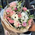 Альстромерия - 5 шт. Эвкалипт - 7 шт. Гвоздика - 5 шт. Гербера - 1 шт. Французская роза - 3 шт. Львиный зев - 5 шт. хризантемы - 1 шт.