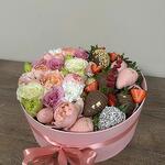 Лизиантус - 3 шт. Хризантема кустовая - 1 шт. Роза - 2 шт. Клубника в шоколаде - 13 шт. спрей розы кустовые - 3 шт.
