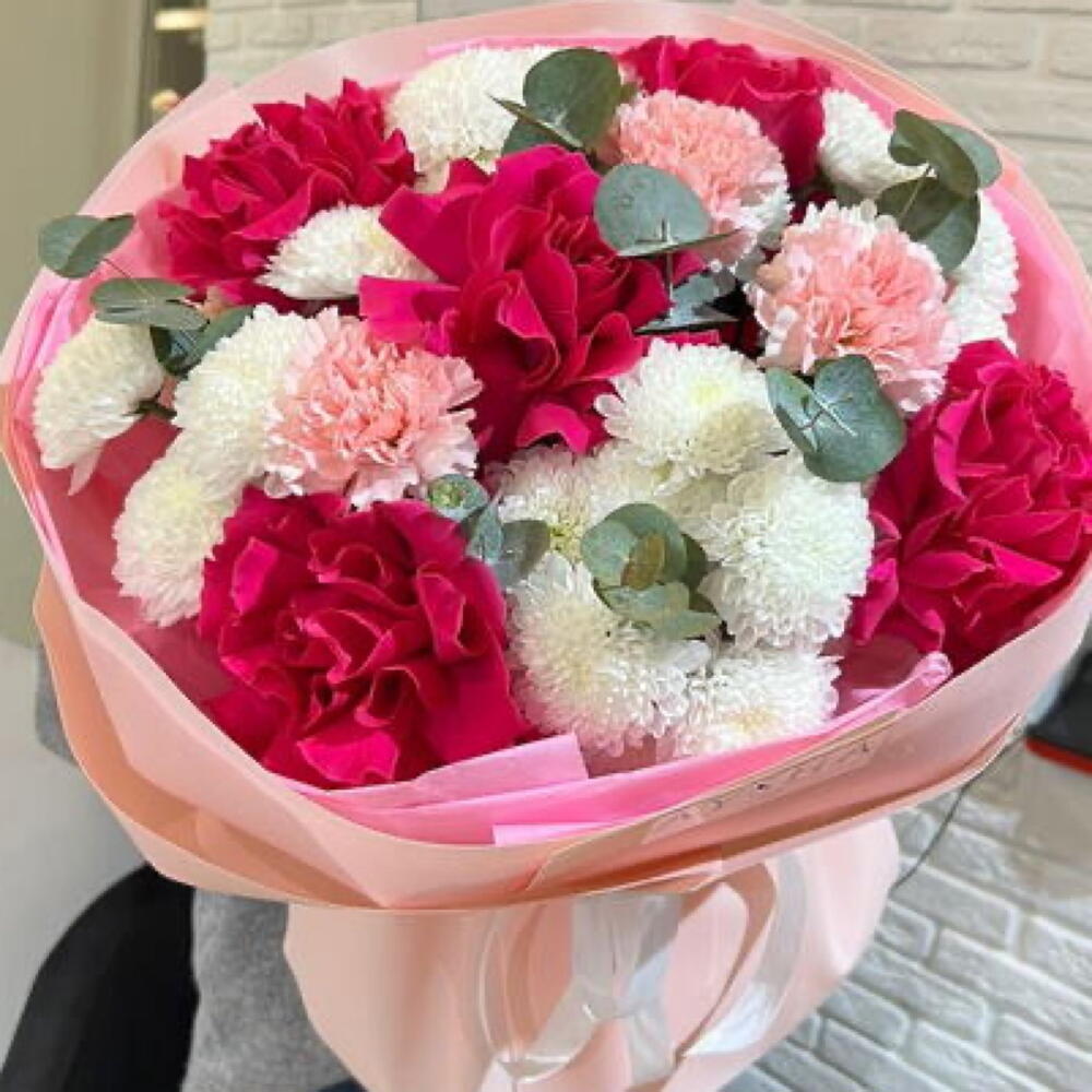 Хризантема кустовая - 5 шт. Гвоздика - 3 шт. Голландская роза - 5 шт. Эвкалипт Микс - 2 шт.