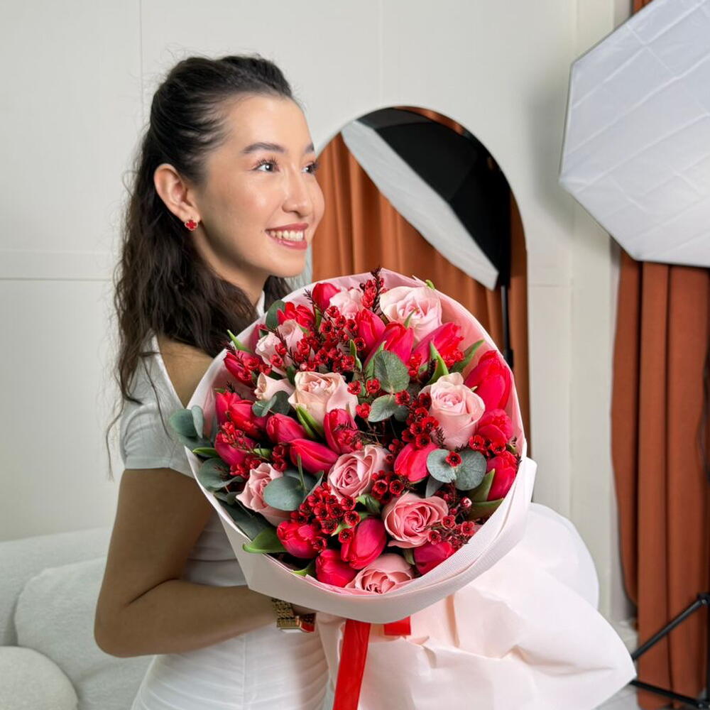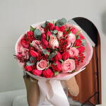 Сочетание пионовидных роз, алых тюльпанов и воздушной зелени — букет, который говорит о чувствах без слов. Идеальный выбор, когда хочется удивить, порадовать и оставить тёплое воспоминание надолго.