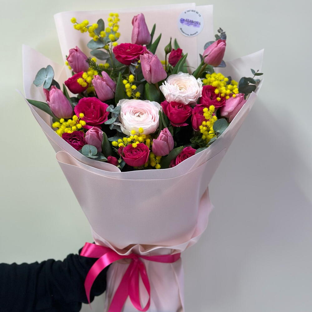 Мимоза - 7 шт. Тюльпан - 9 шт. Эвкалипт - 5 шт. Спрей роза - 5 шт. Ранункулус - 2 шт.