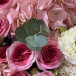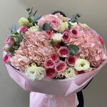 Гортензия - 3 шт. Кустовая роза - 5 шт. Эвкалипт Цинерея - 2 шт. эустома белая - 5 шт.