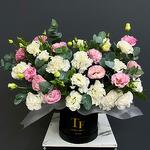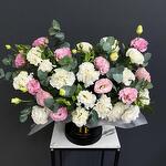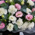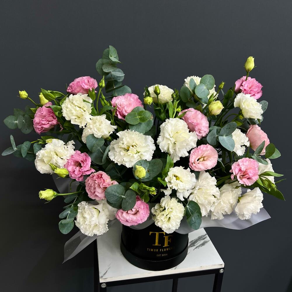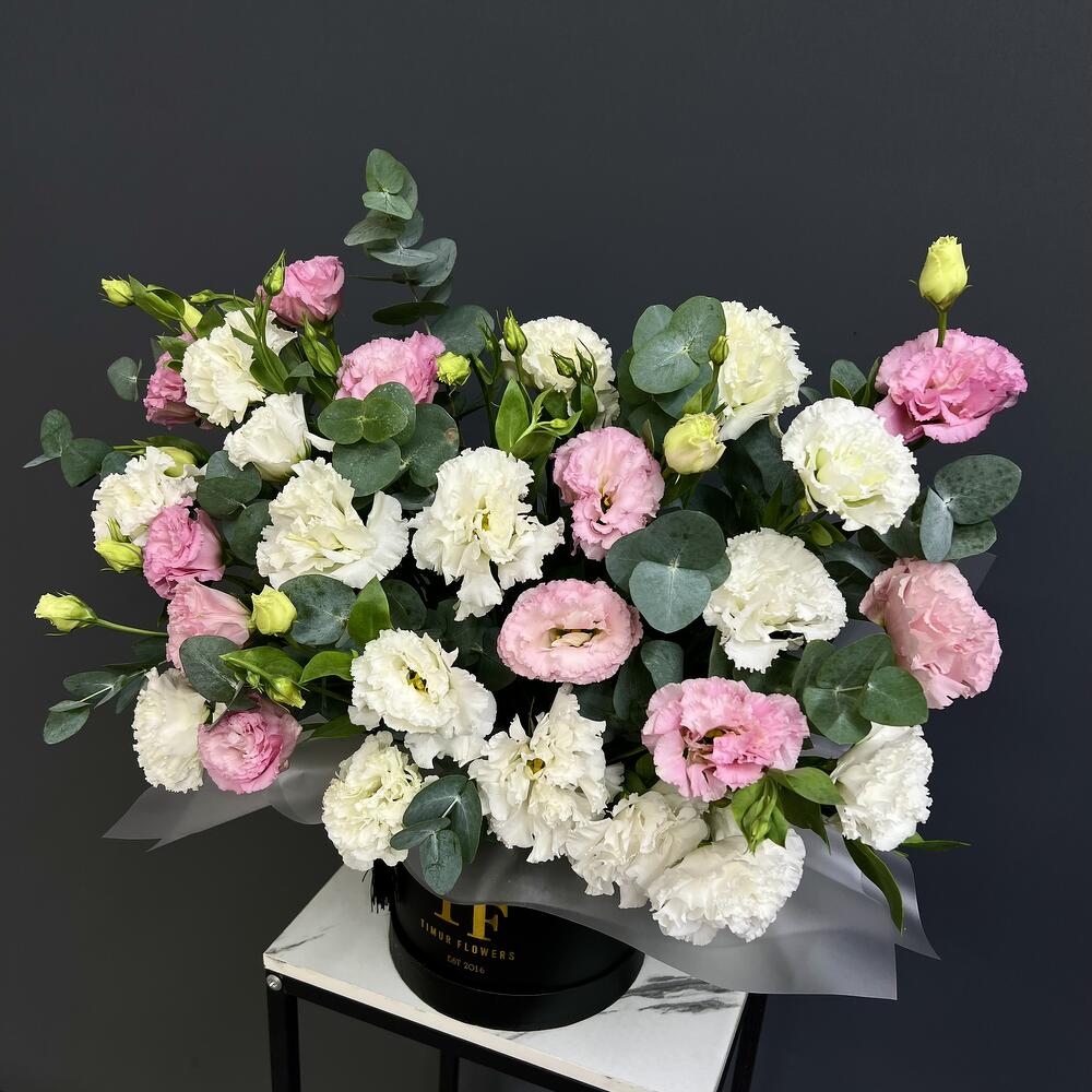 Микс Лизиантусов (Эустома) с эвкалиптом в тубусе