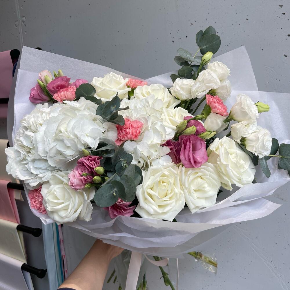Гортензия - 2 шт. Лизиантус - 5 шт. Эвкалипт - 5 шт. Гвоздика - 5 шт. розы - 7 шт.