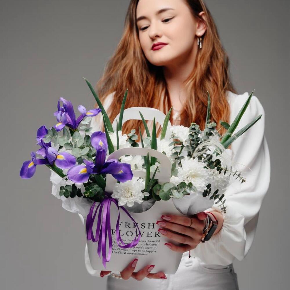 Ирис - 3 шт. Хризантема кустовая - 2 шт. Эвкалипт - 5 шт. Сумка - 1 шт. Оазис флористический - 1 шт.
