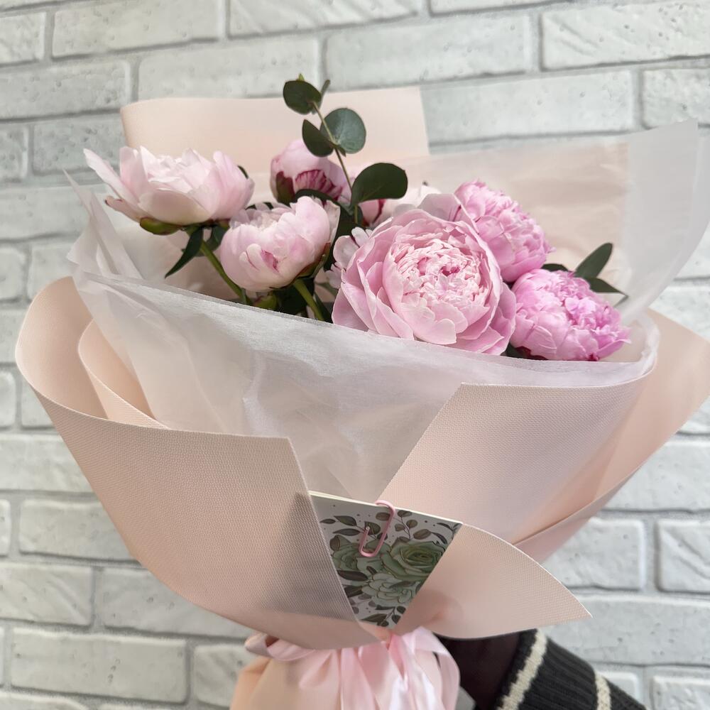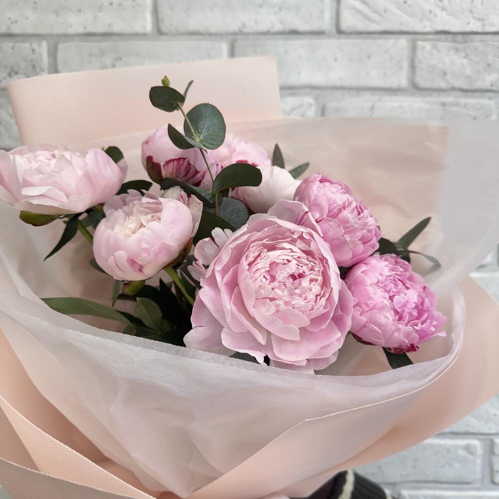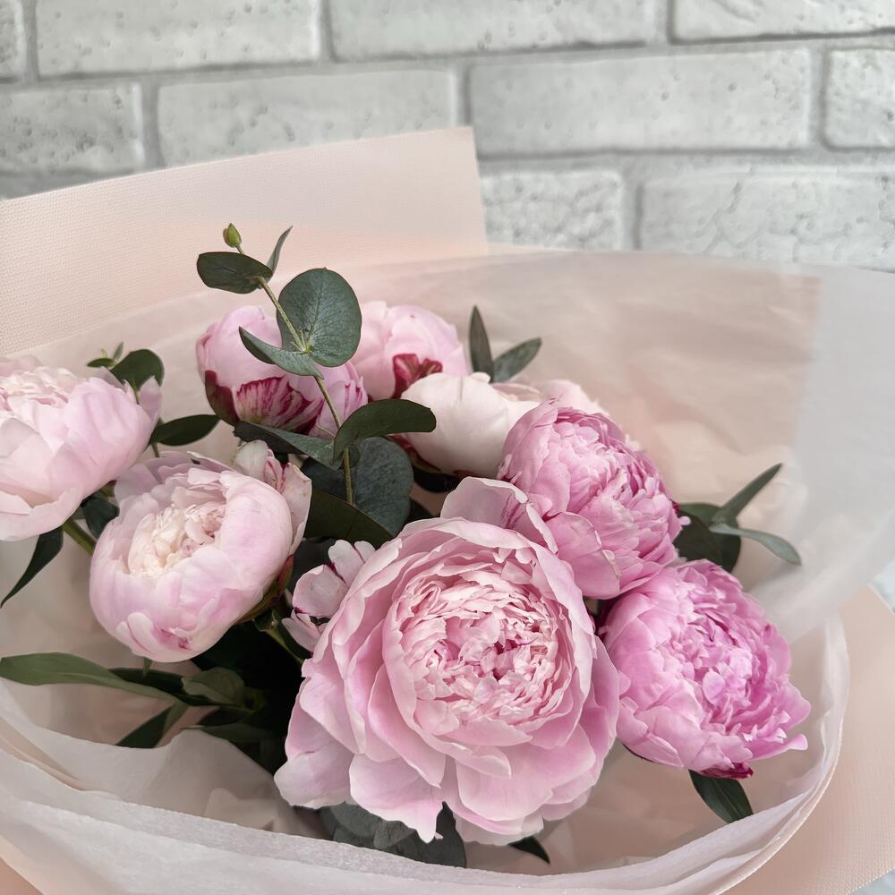 Пион - 9 шт. Эвкалипт - 3 шт. Тишью - 2 шт. Бант - 1 шт. Фоамиран - 3 шт.