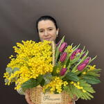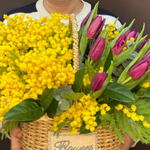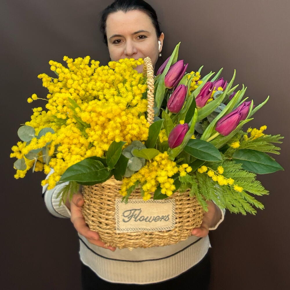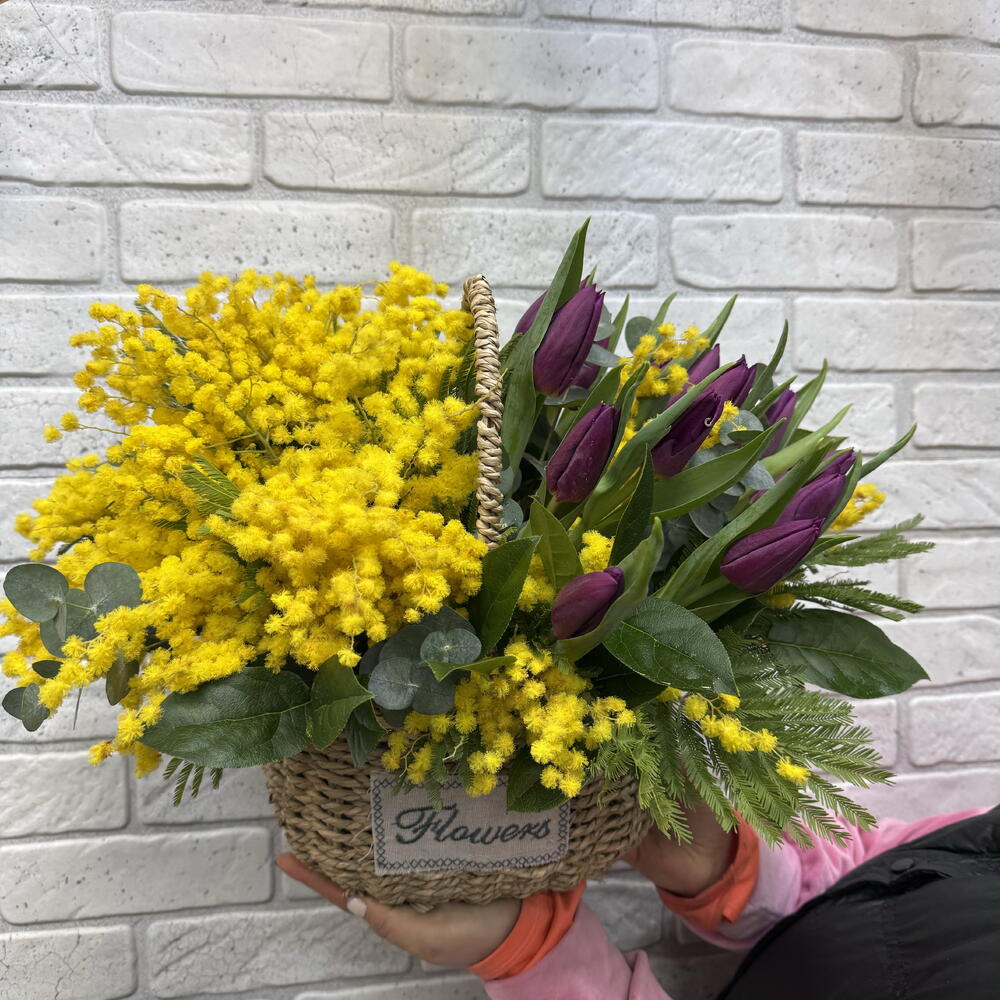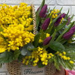 Тюльпан - 13 шт. Эвкалипт - 5 шт. Корзина плетеная - 1 шт. мимоза пучок - 1 шт. Салал Экстра - 5 шт.