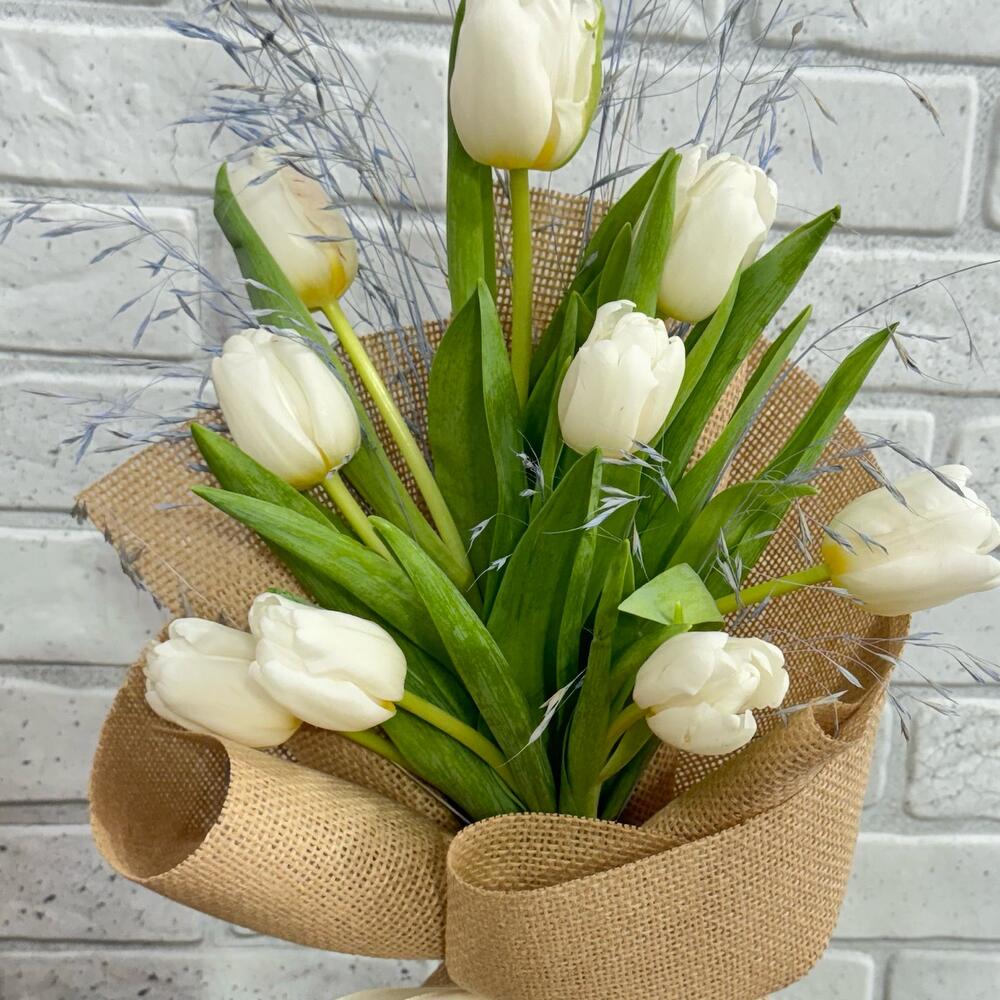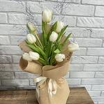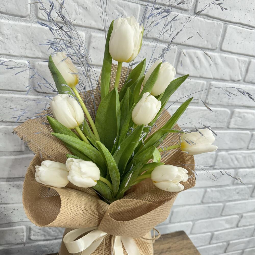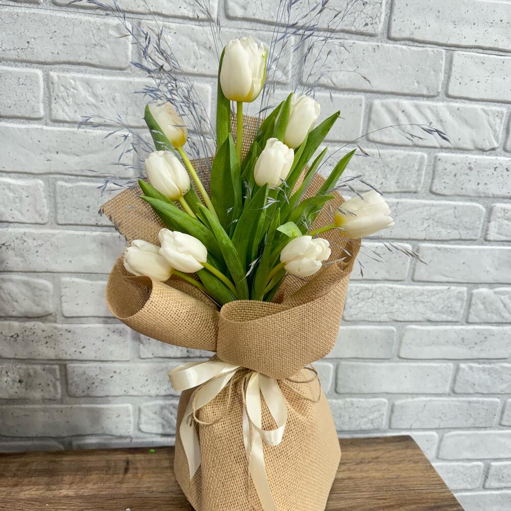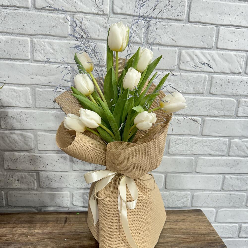 Лента - 1 шт. Тюльпан - 9 шт. Рогожа - 3 шт. бичевав натуральная - 1 шт. сорга стабилизированная - 5 шт.