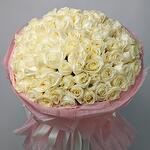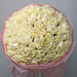 Эта композиция из кремовых роз — воплощение утончённой элегантности и мягкой роскоши. Каждый бутон словно шёпот нежных слов, а обрамление из розовой упаковки добавляет едва уловимый романтический оттенок. Букет кажется бесконечным, как океан чувств, где каждый цветок — это признание в любви или дань уважения.