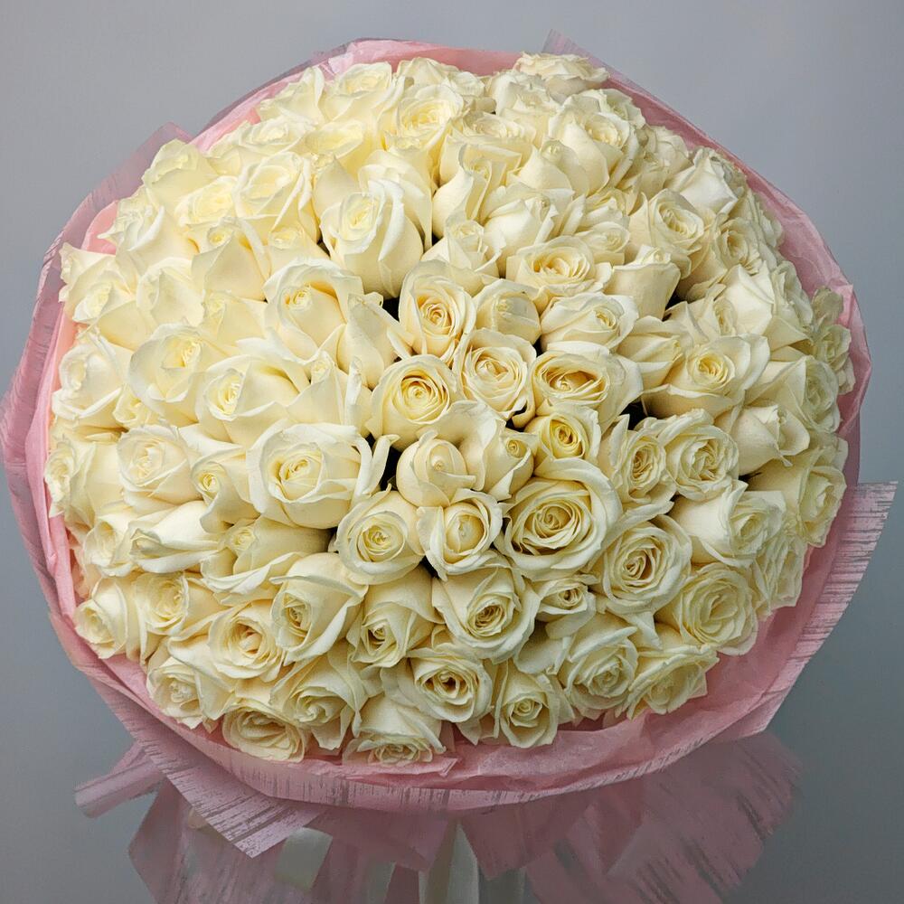 Эта композиция из кремовых роз — воплощение утончённой элегантности и мягкой роскоши. Каждый бутон словно шёпот нежных слов, а обрамление из розовой упаковки добавляет едва уловимый романтический оттенок. Букет кажется бесконечным, как океан чувств, где каждый цветок — это признание в любви или дань уважения.