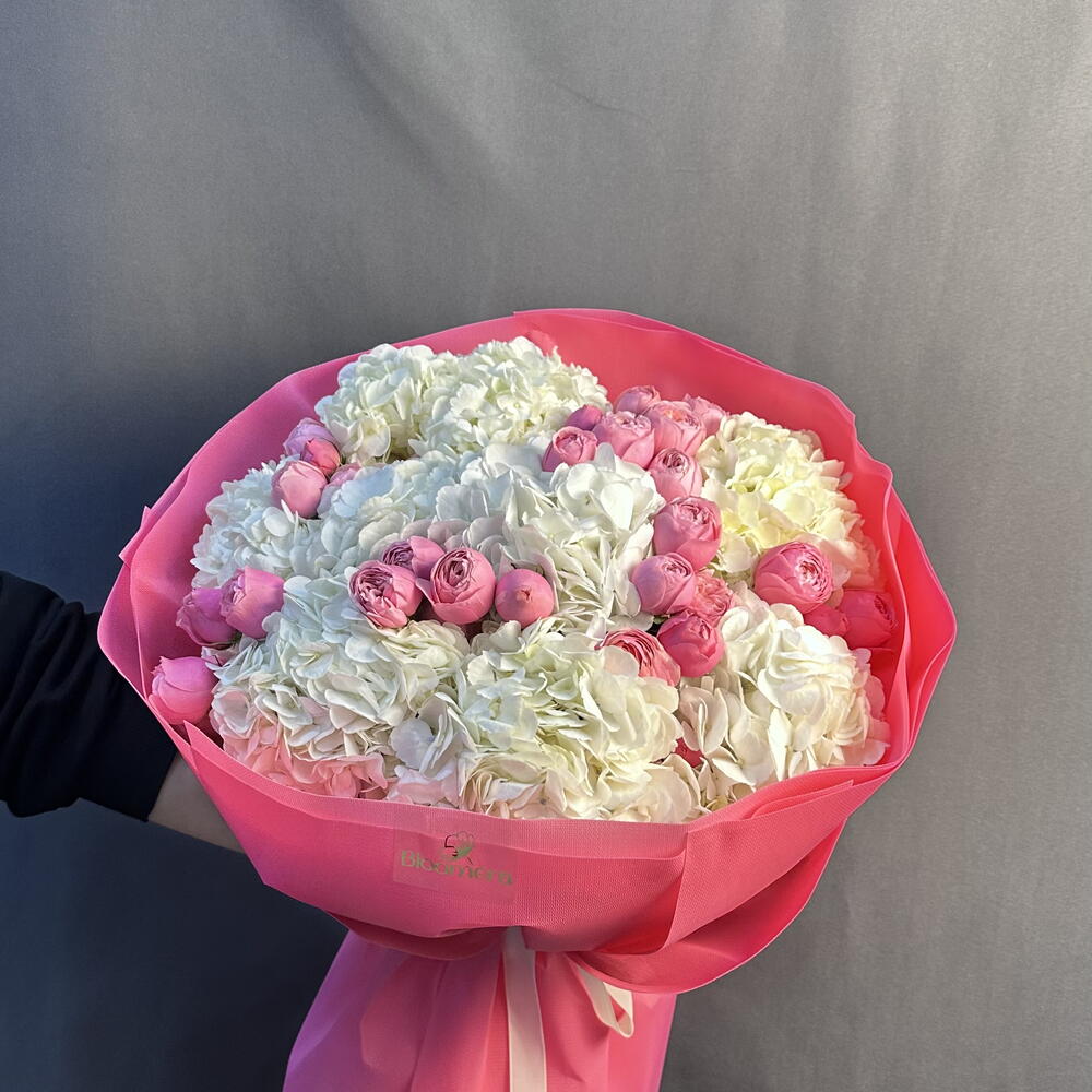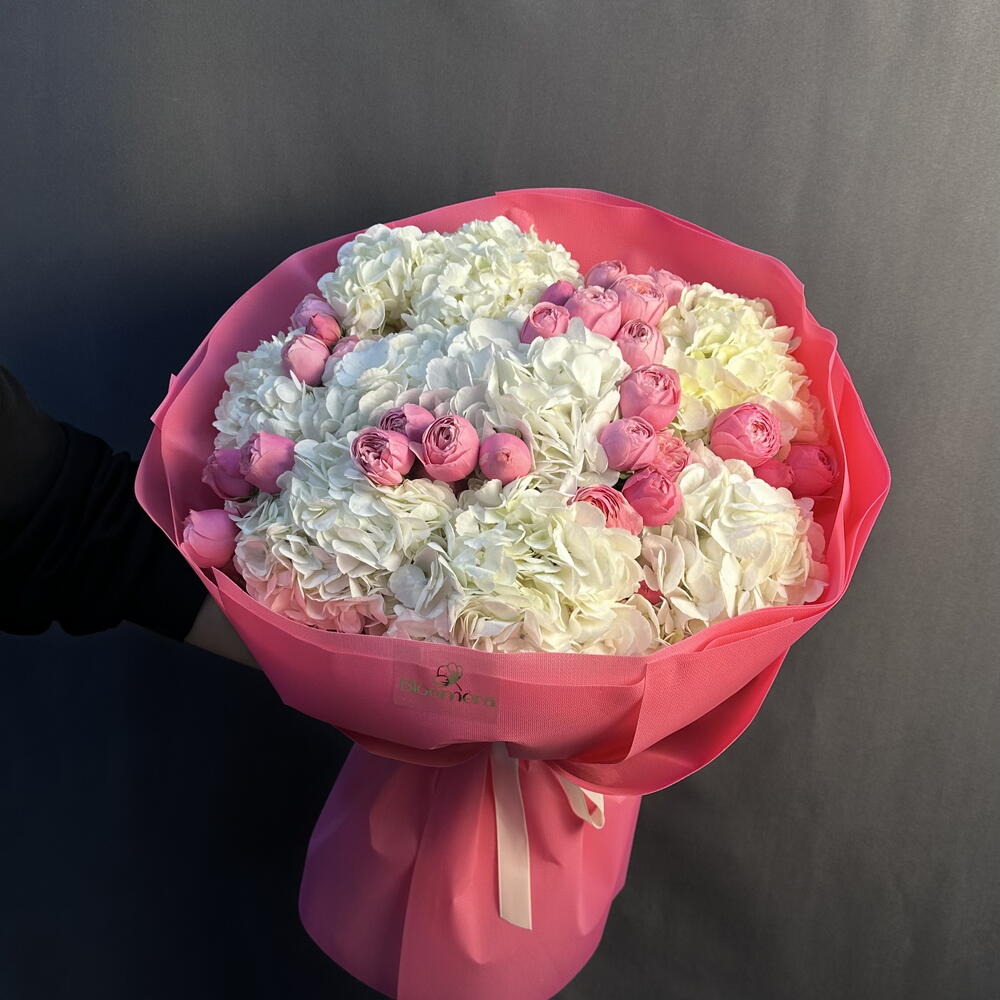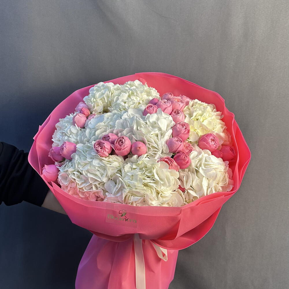 Пионовидная кустовая роза - 5 шт. белая гортензия - 9 шт.