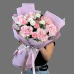 Лизиантус - 2 шт. Эвкалипт - 1 шт. Гвоздика - 3 шт. Оформление - 1 шт. розы - 7 шт.