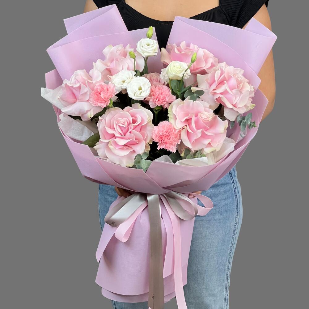 Лизиантус - 2 шт. Эвкалипт - 1 шт. Гвоздика - 3 шт. Оформление - 1 шт. розы - 7 шт.