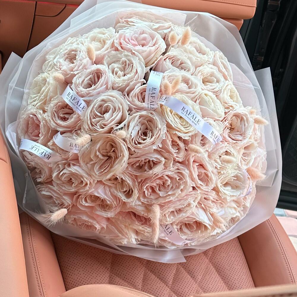 Открытка - 1 шт. пионовидная роза (англия) - 51 шт. лагурус (голландия) - 3 шт. калька в ассортименте - 4 шт.