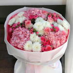 Восхитительное сочетание цветов в данном авторском букете прекрасно подойдет для сюрприза на любой торжественный случай. Три великолепные гортензии нежного розового цвета вместе с пятнадцатью белоснежными хризантемами создают настоящее цветочное облако. Нежность и свежесть композиции подчеркивают три розовые розы и шесть веток спрей розы. Букет идеально сохраняет свежесть и аромат, которые послужат основой приятных воспоминаний о важном событии.