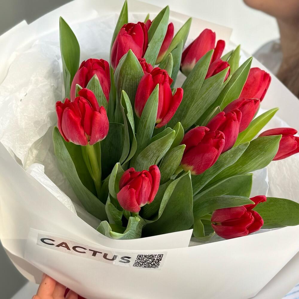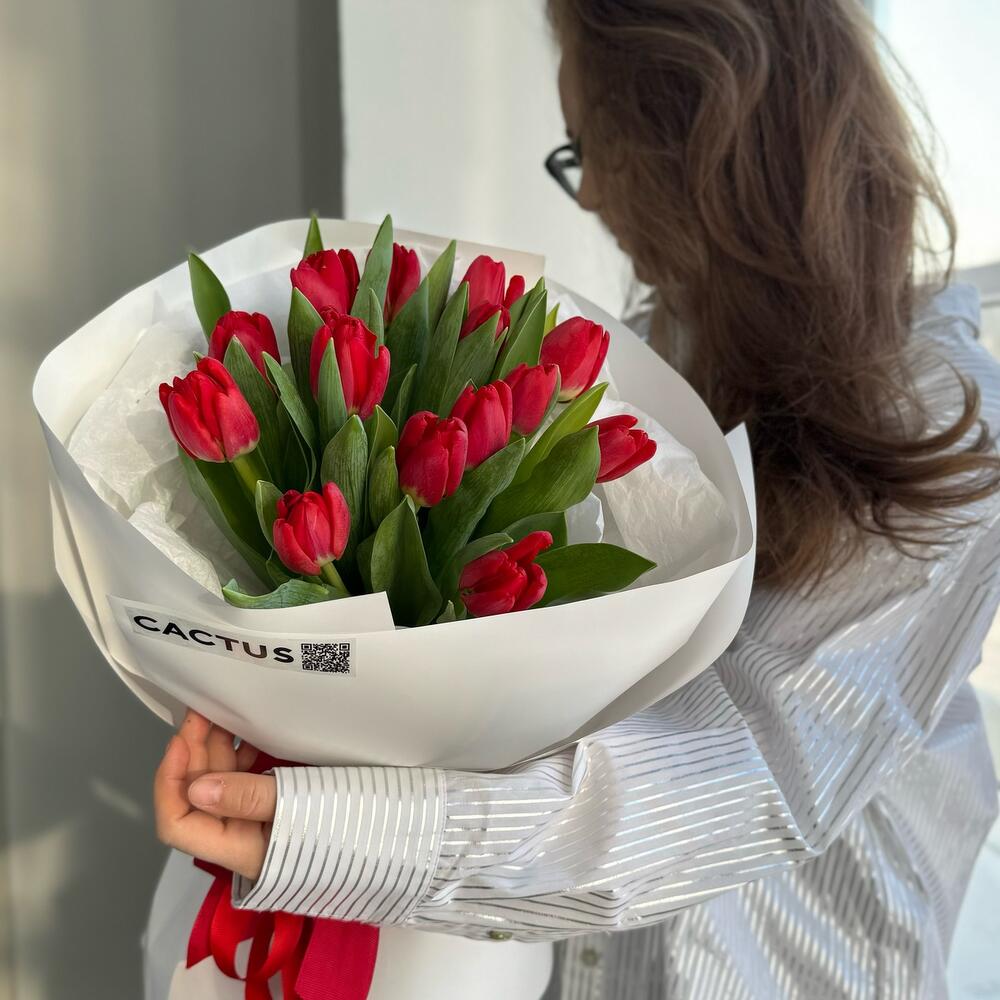 Моно букет из 15 красных тюльпанов в фирменной упаковке