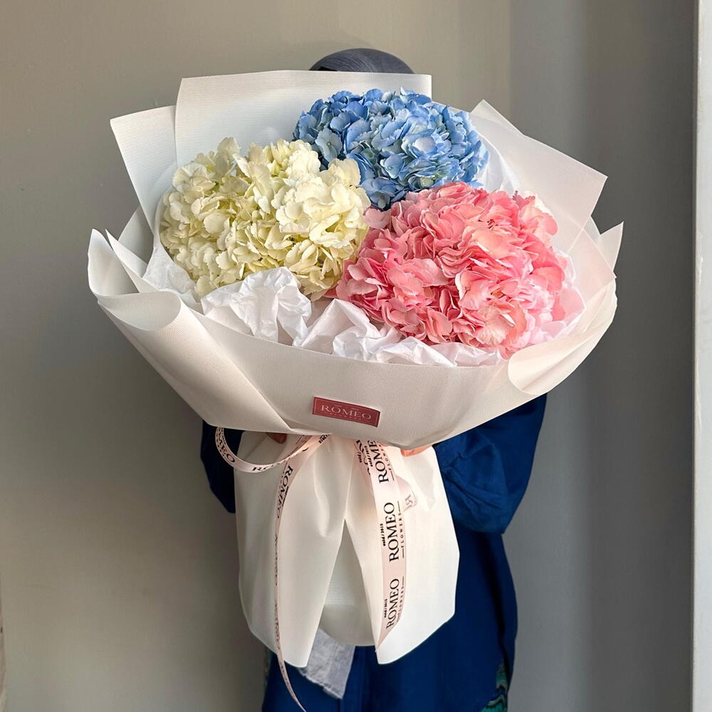 Гортензия - 3 шт. Лента - 1 шт. Оформление - 1 шт.