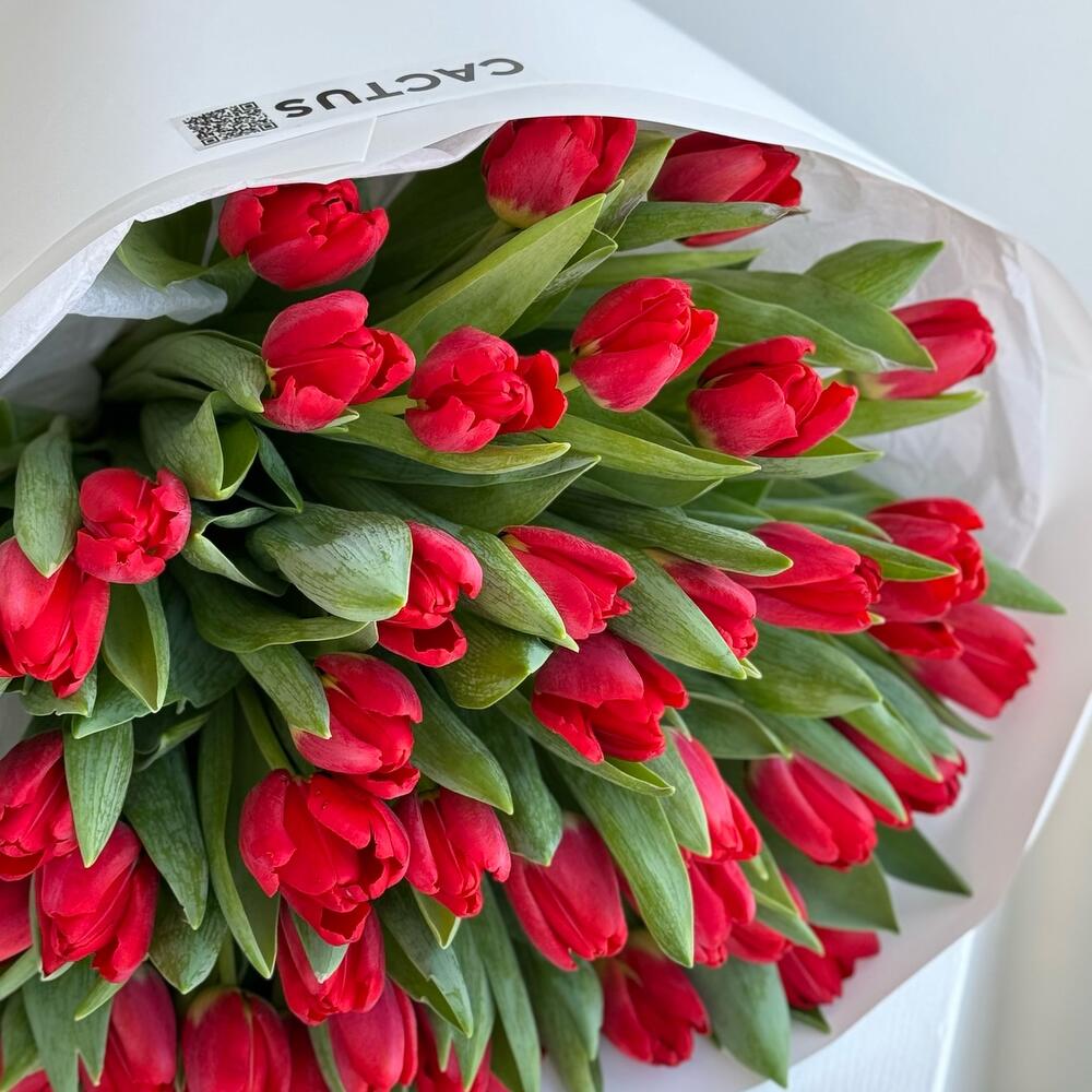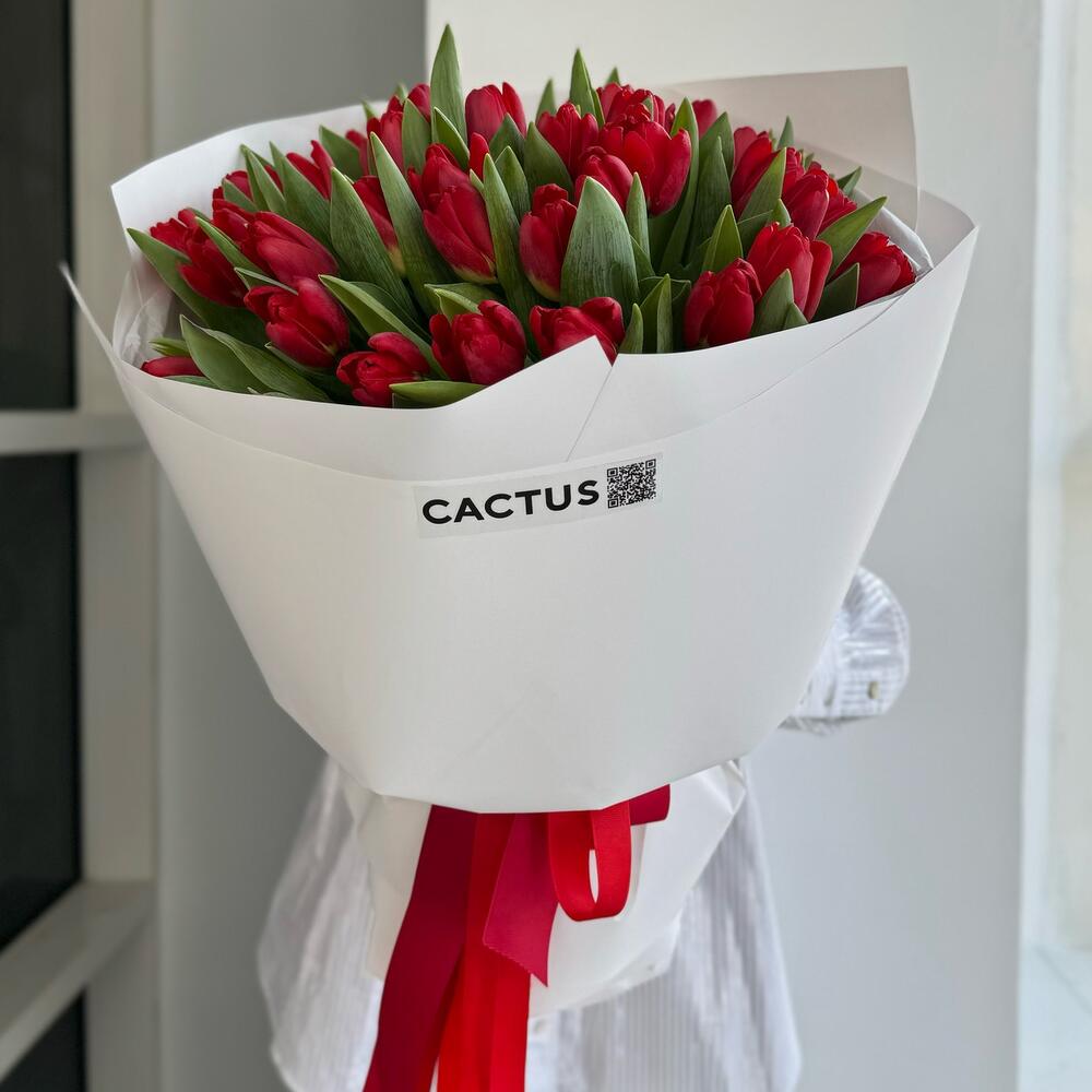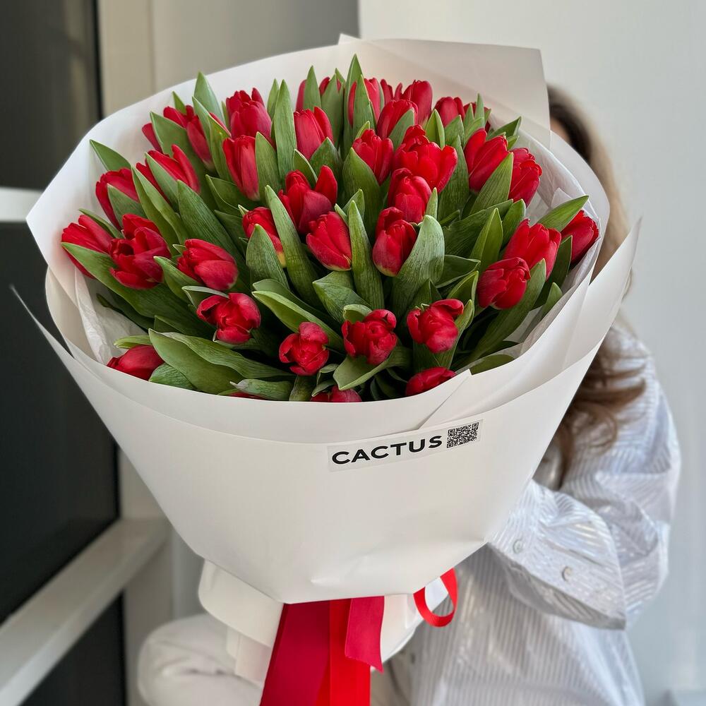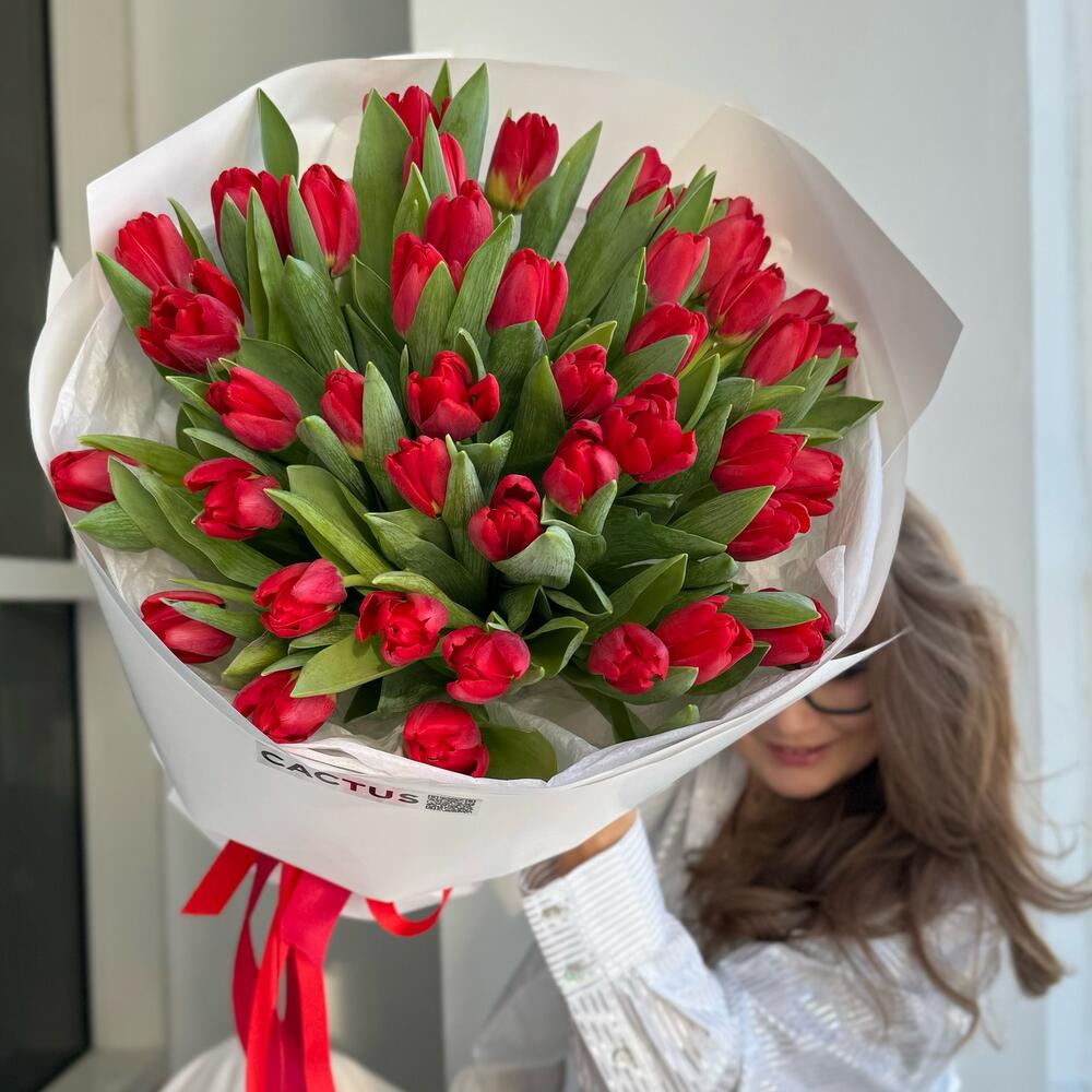 Моно букет из 45 красных тюльпанов в фирменной упаковке