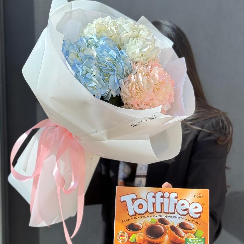 Гортензия - 3 шт. Упаковка дизайнерская - 5 шт. toffifee - 1 шт.
