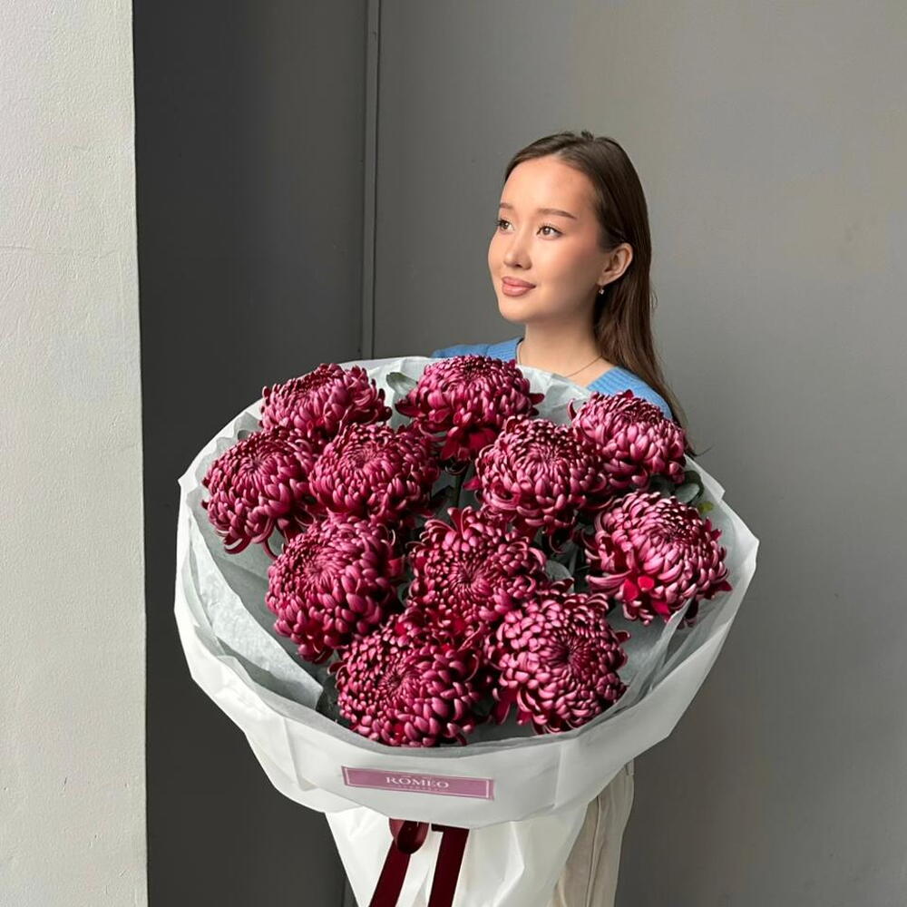 Лента - 1 шт. Эвкалипт - 1 шт. Хризантема одноголовая - 11 шт. Оформление - 1 шт.