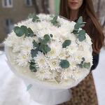 Объемный нежный монобукет из белых кустовых хризантем с эвкалиптом