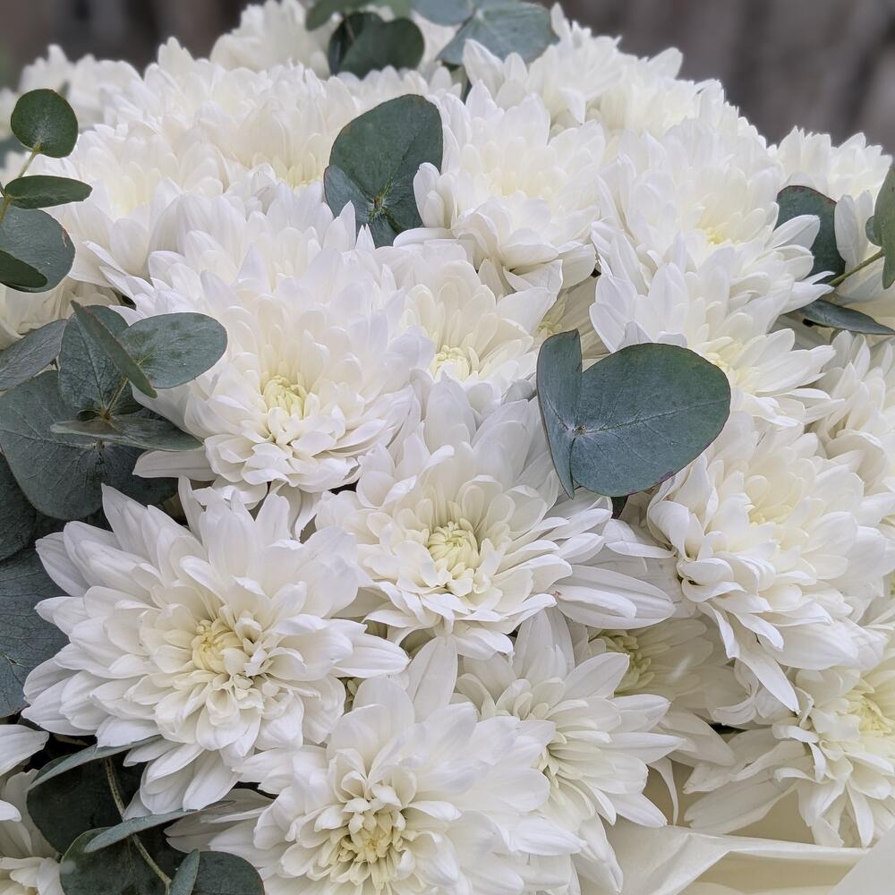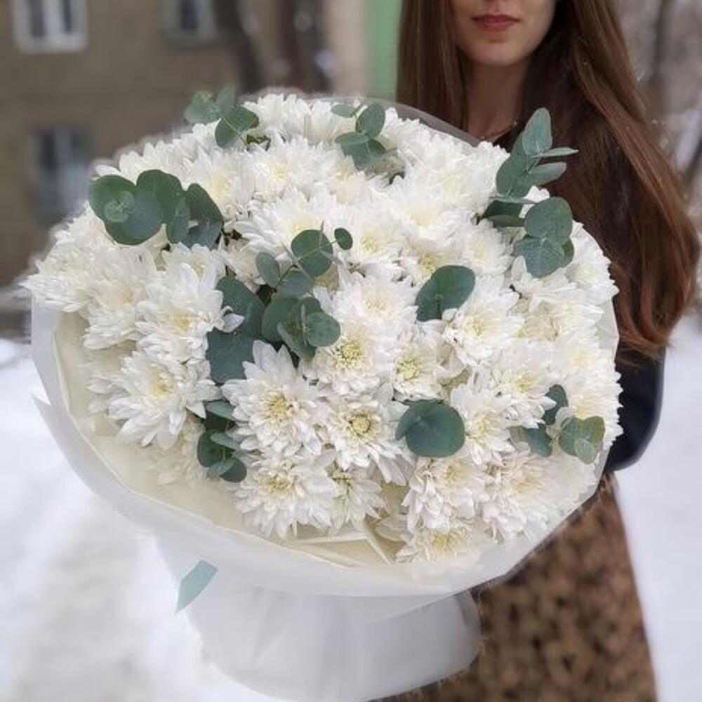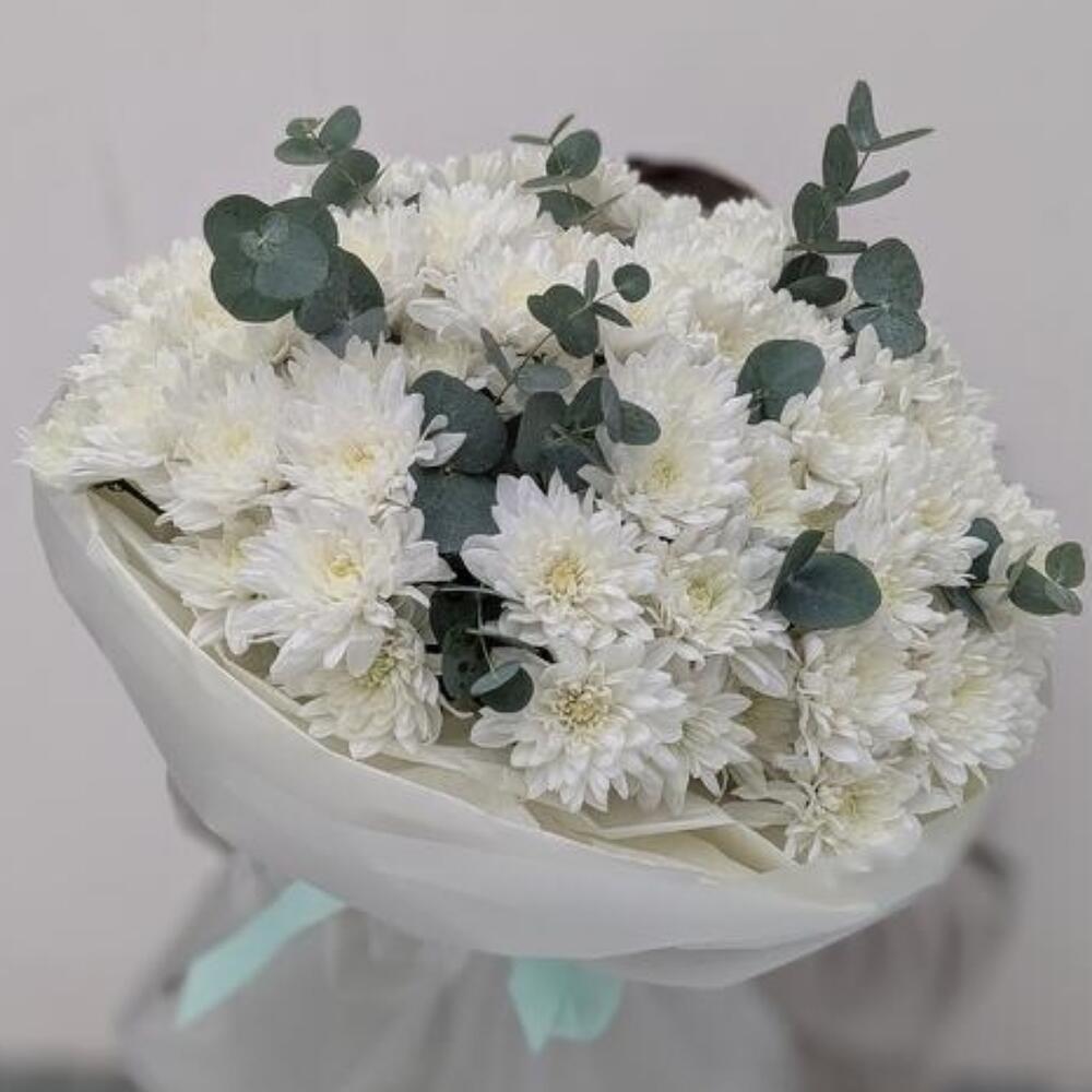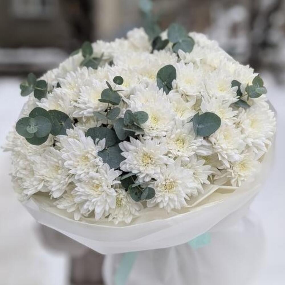 Объемный нежный монобукет из белых кустовых хризантем с эвкалиптом