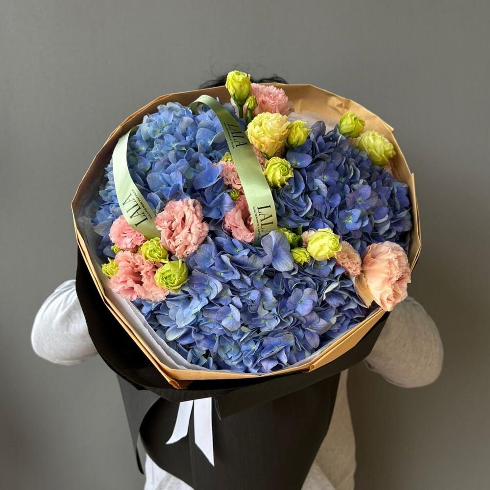 Моно букет с гортензиями и лизиантусами