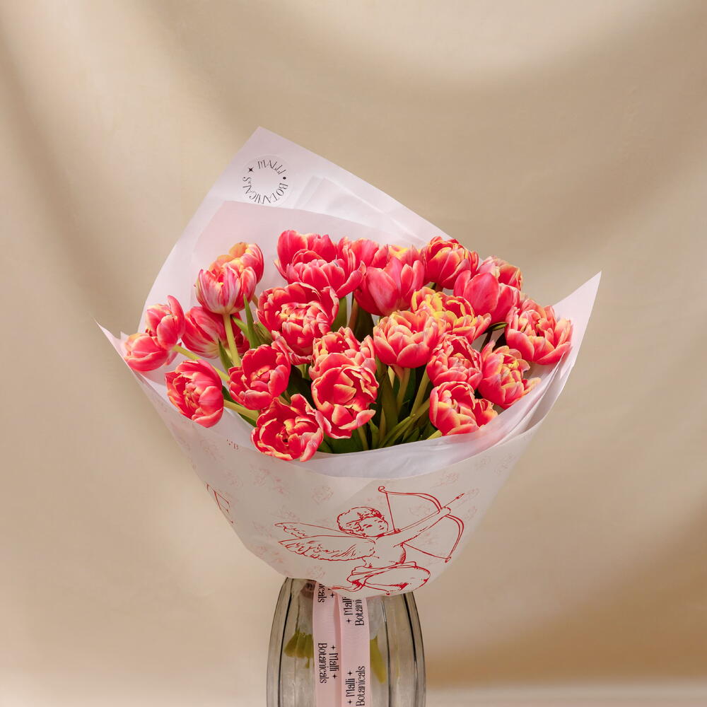 Букет утонченных тюльпан с розовым градиентом напоминают легкий румянец. Их пышные бутоны создают ощущение воздушности и романтики. Оформлен в тематическую бумагу и коробку Malli Botanicals с открыткой по желанию. На фото букет в размере S, 25шт.