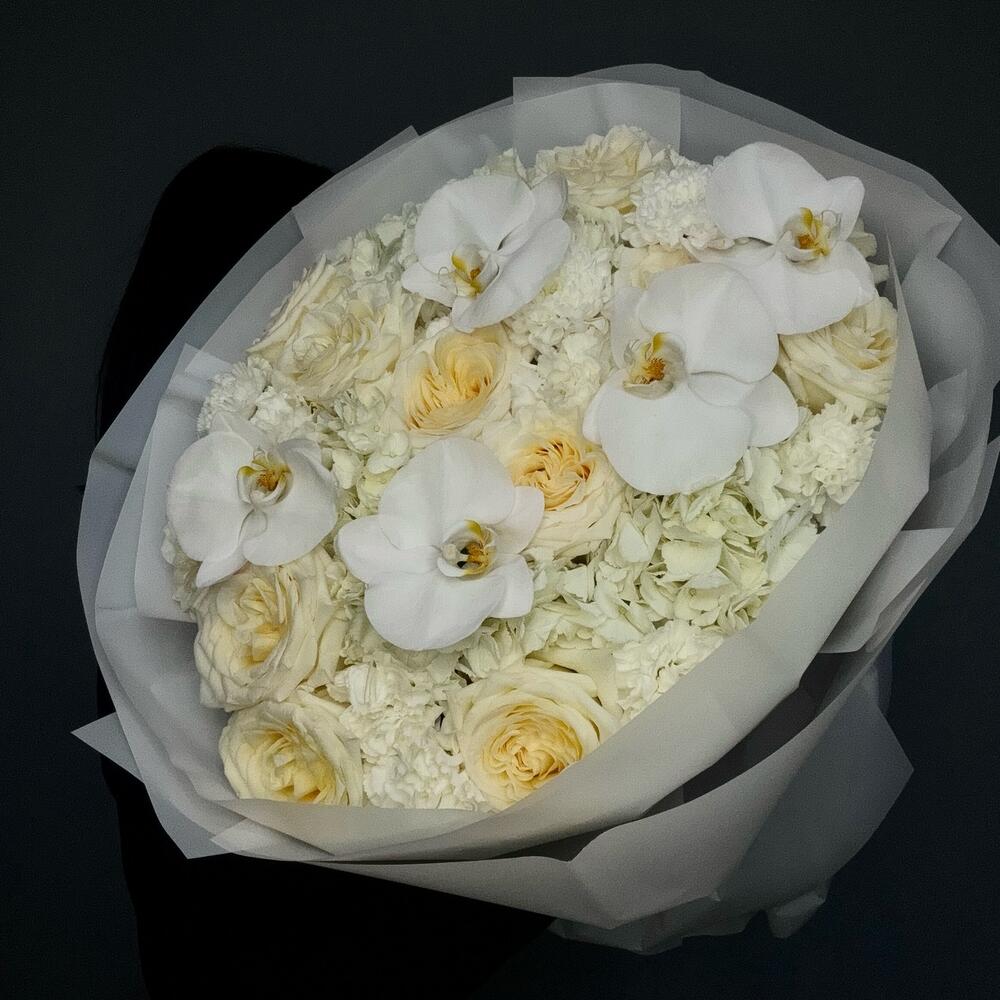 Гортензия - 3 шт. Хризантема кустовая - 5 шт. Диантус - 7 шт. Роза пионовидная - 13 шт. Фаленопсис - 5 шт.