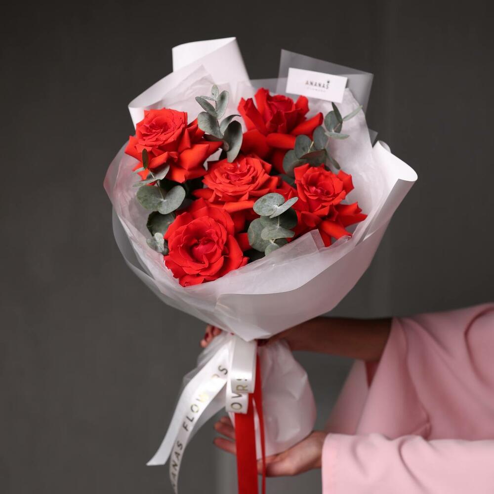 Эвкалипт - 1 шт. Упаковка дизайнерская - 1 шт. Роза Эквадор 60 см - 5 шт.