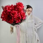 Монобукет из ярко-розовых вывернутых роз в дизайнерской упаковке