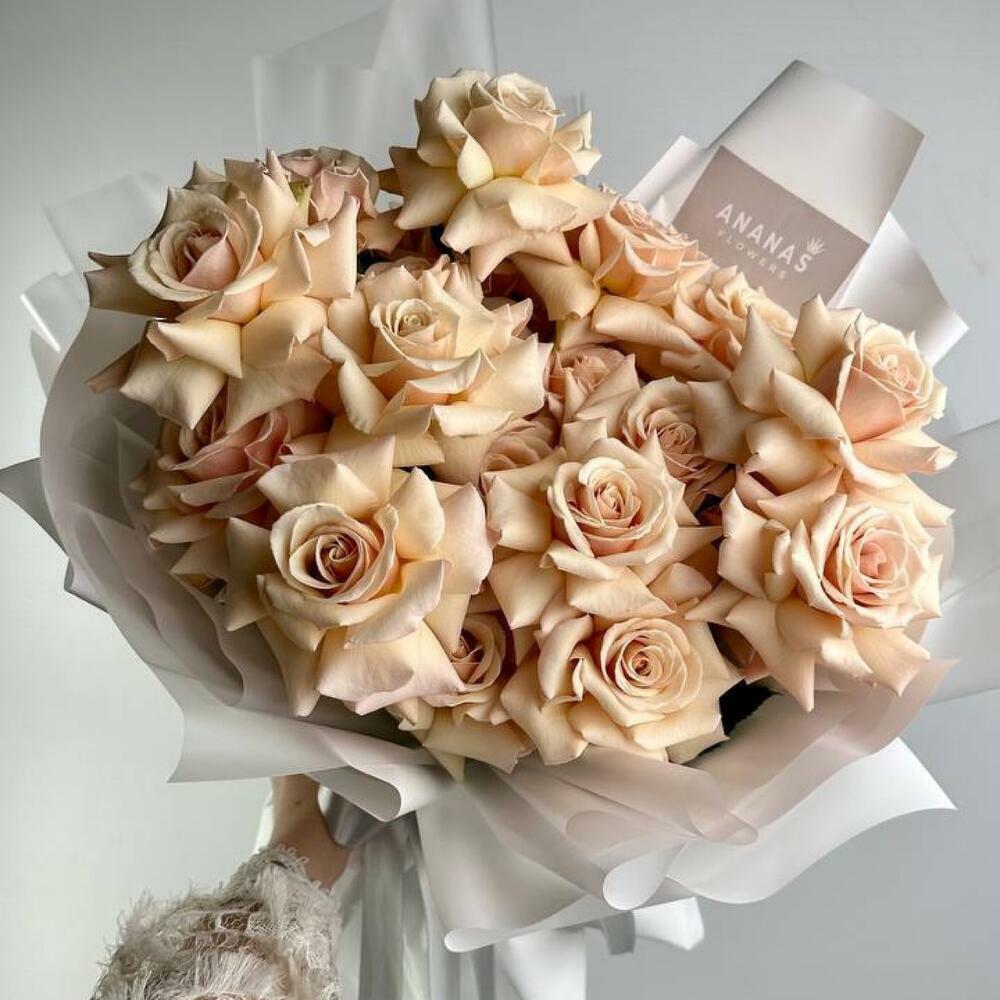Букет из пышных вывернутых песочных Эквадорских роз сорта sahara в дизайнерской упаковке