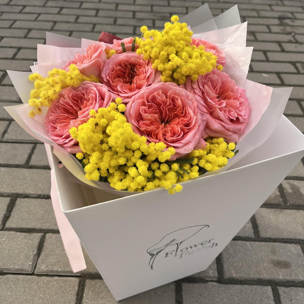 Мимоза - 3 шт. Аквабокс - 1 шт. коробка транспортировочная - 1 шт. роза pink expression - 7 шт.