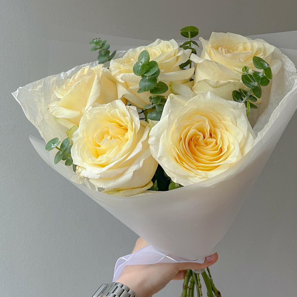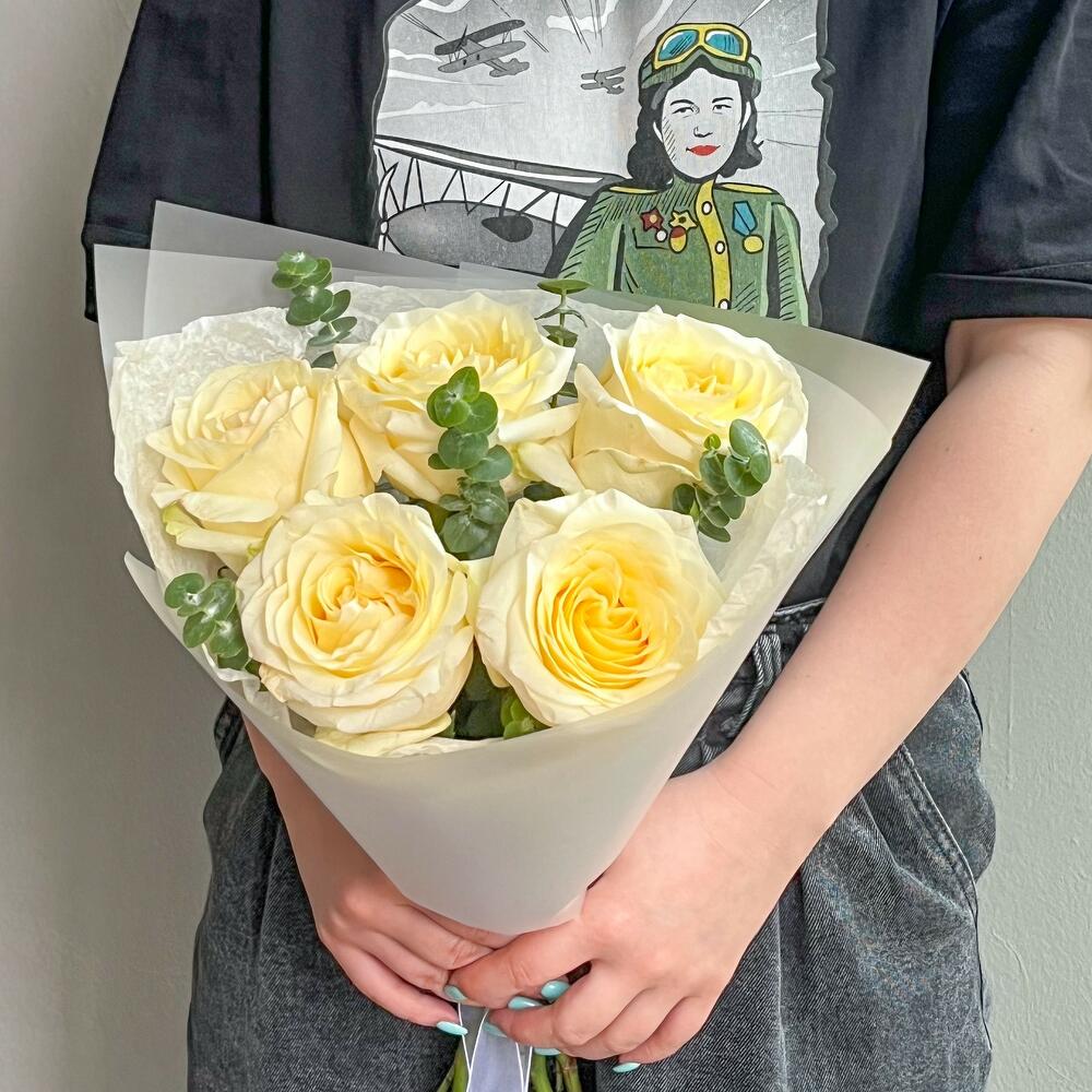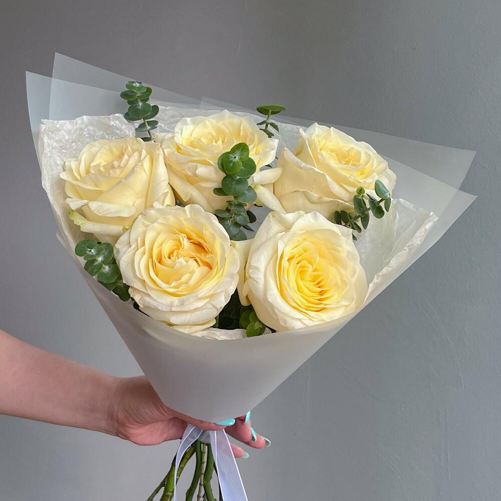 Эвкалипт - 1 шт. эквадорская пионовидная роза кендллайт - 5 шт.