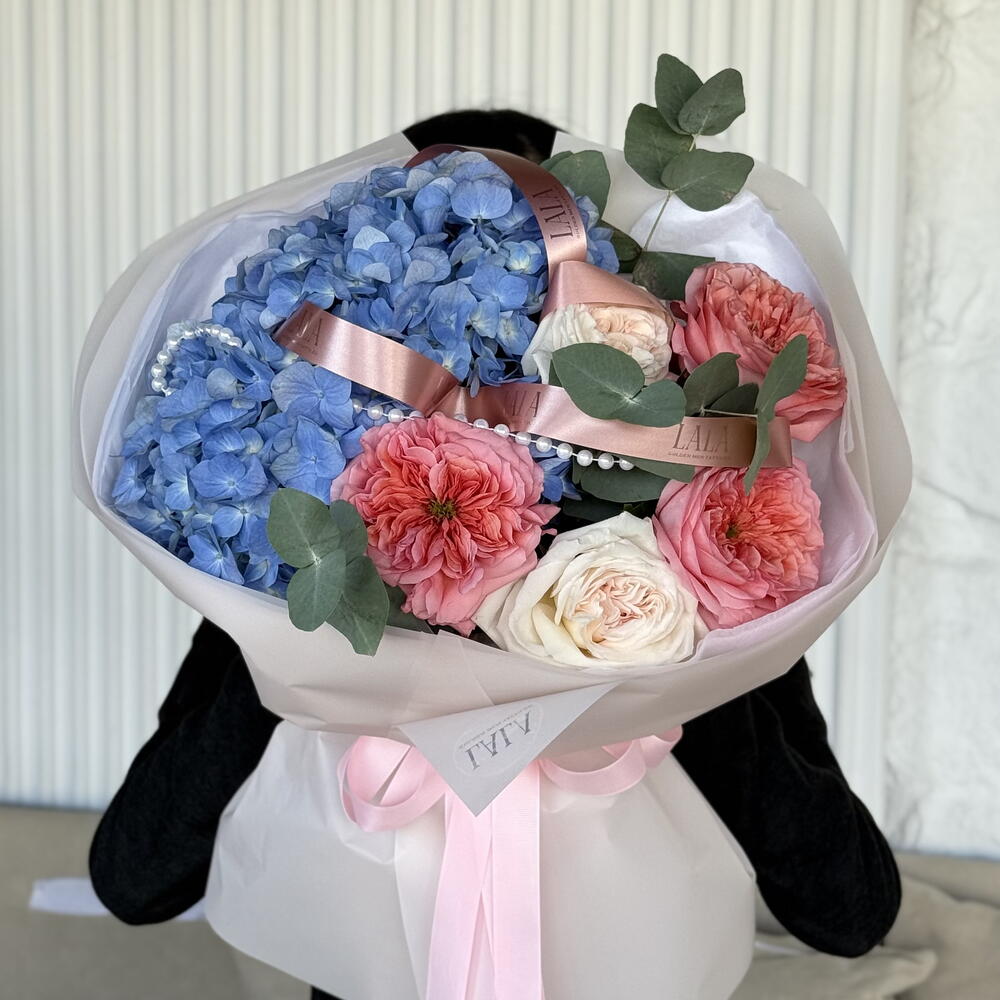 Гортензия - 1 шт. Украшения - 1 шт. Эвкалипт Микс - 1 шт. розы голландские - 2 шт. розы пионовидные - 3 шт.