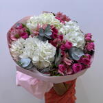 Альстромерия - 5 шт. Гортензия - 3 шт. Эвкалипт - 3 шт. Кустовая роза - 7 шт.