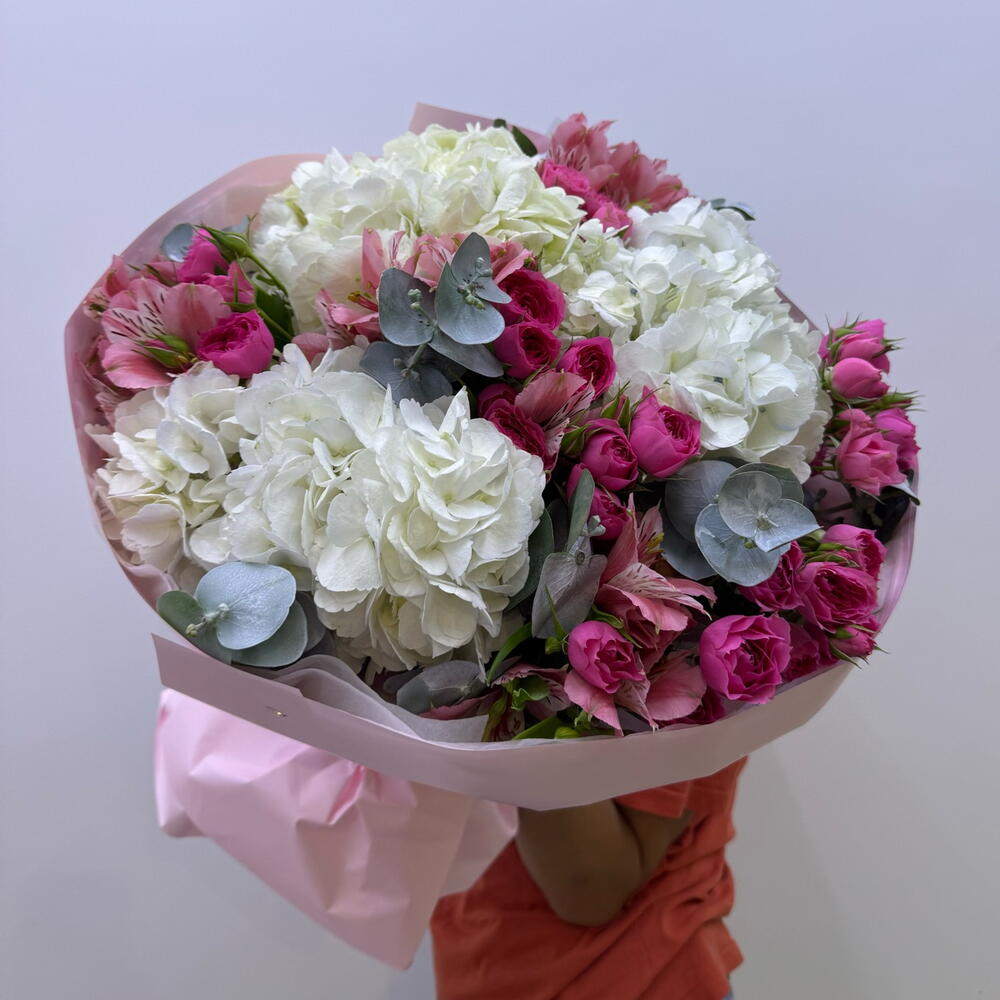 Альстромерия - 5 шт. Гортензия - 3 шт. Эвкалипт - 3 шт. Кустовая роза - 7 шт.