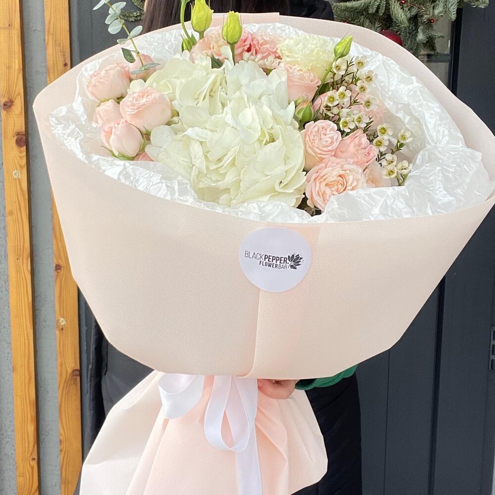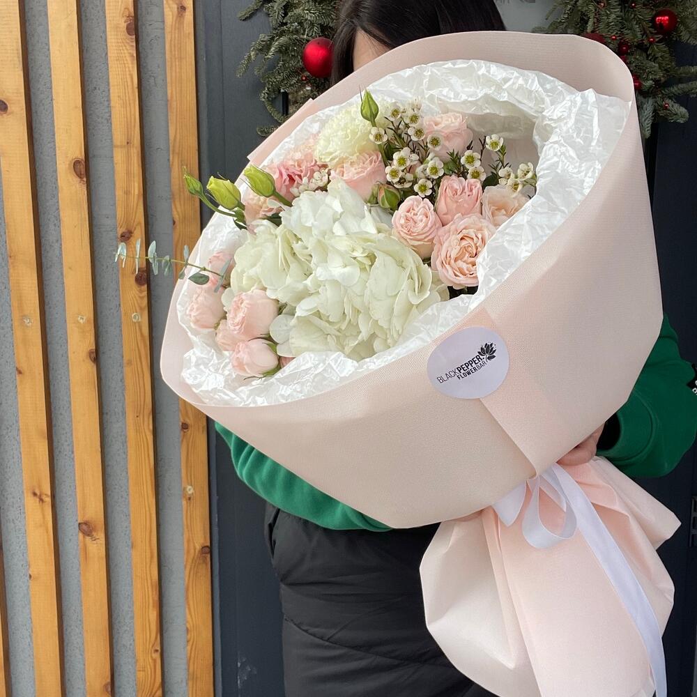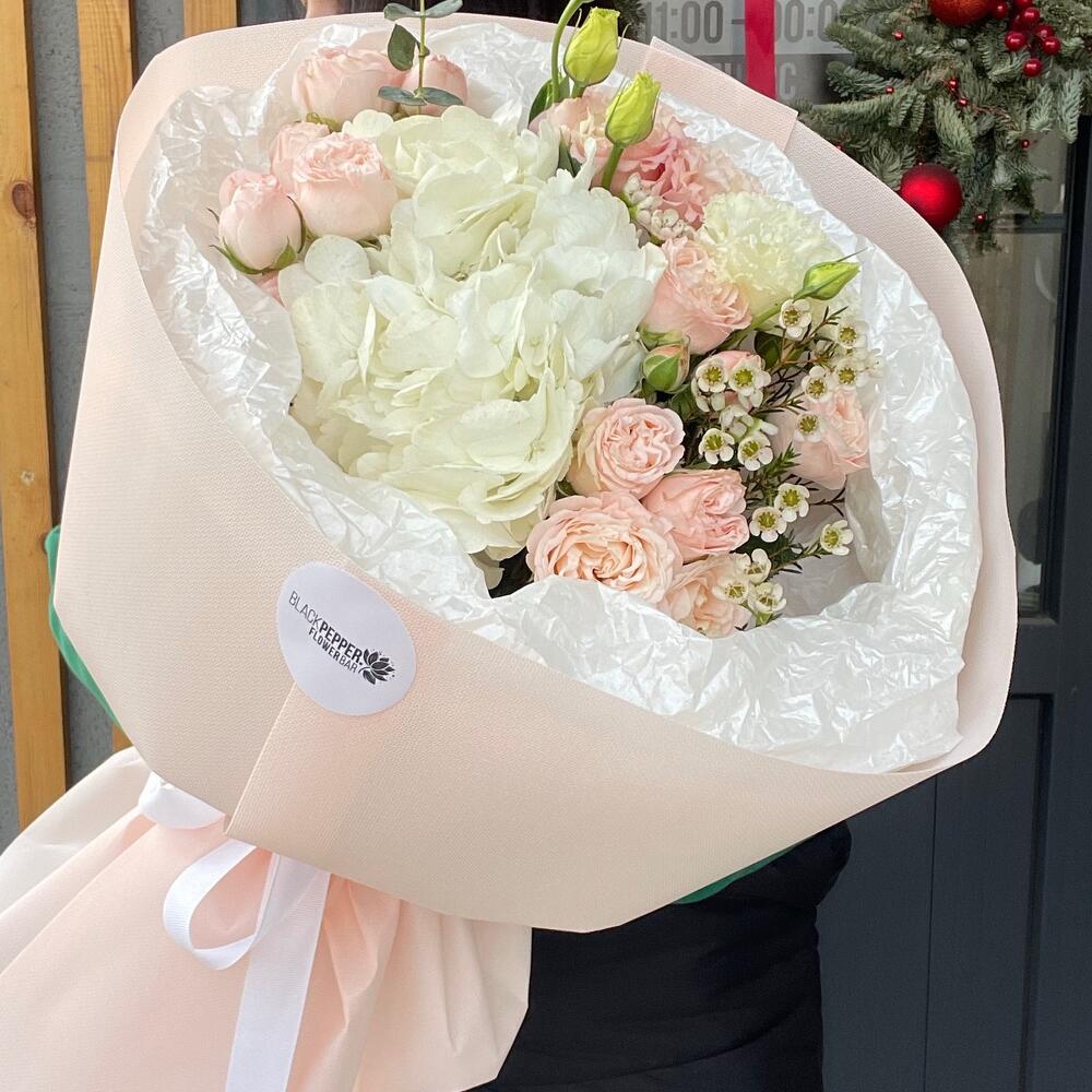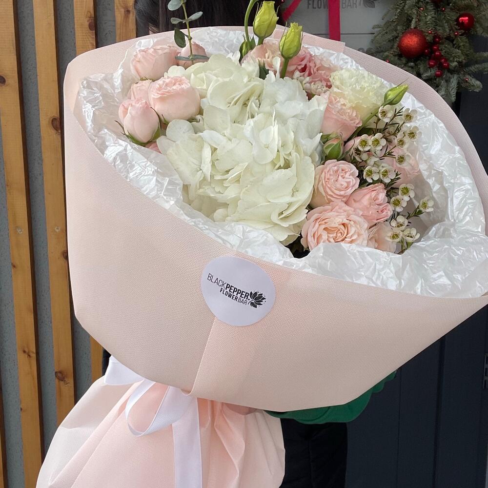 Ваксфлауэр - 2 шт. Гортензия - 1 шт. Кустовая роза - 4 шт.