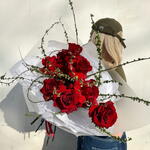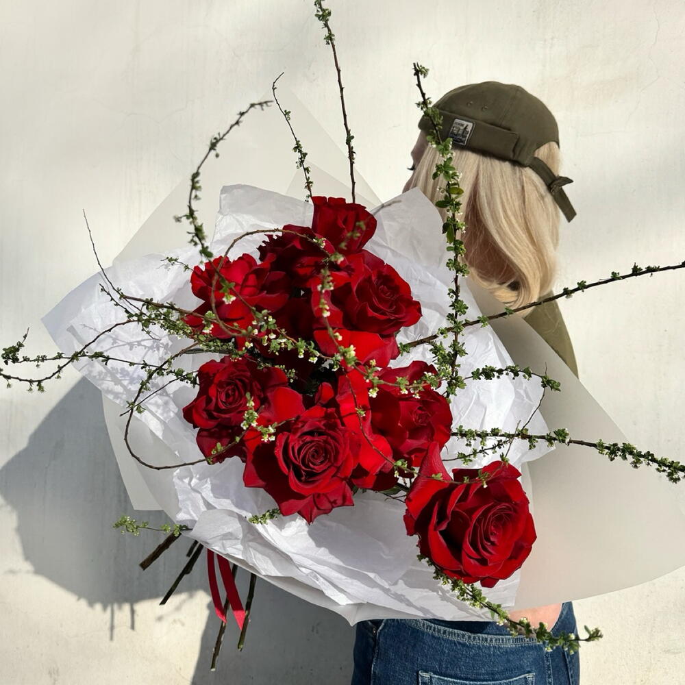Роза красная - 9 шт. Спирея Белая - 2 шт.