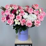 Гортензия - 1 шт. Роза - 21 шт. Хризантема - 1 шт. Гербера - 1 шт. Коробка - 1 шт. кустовые розы - 2 шт.