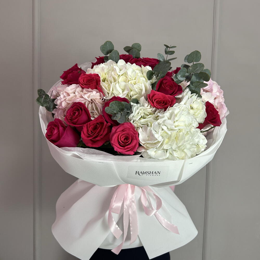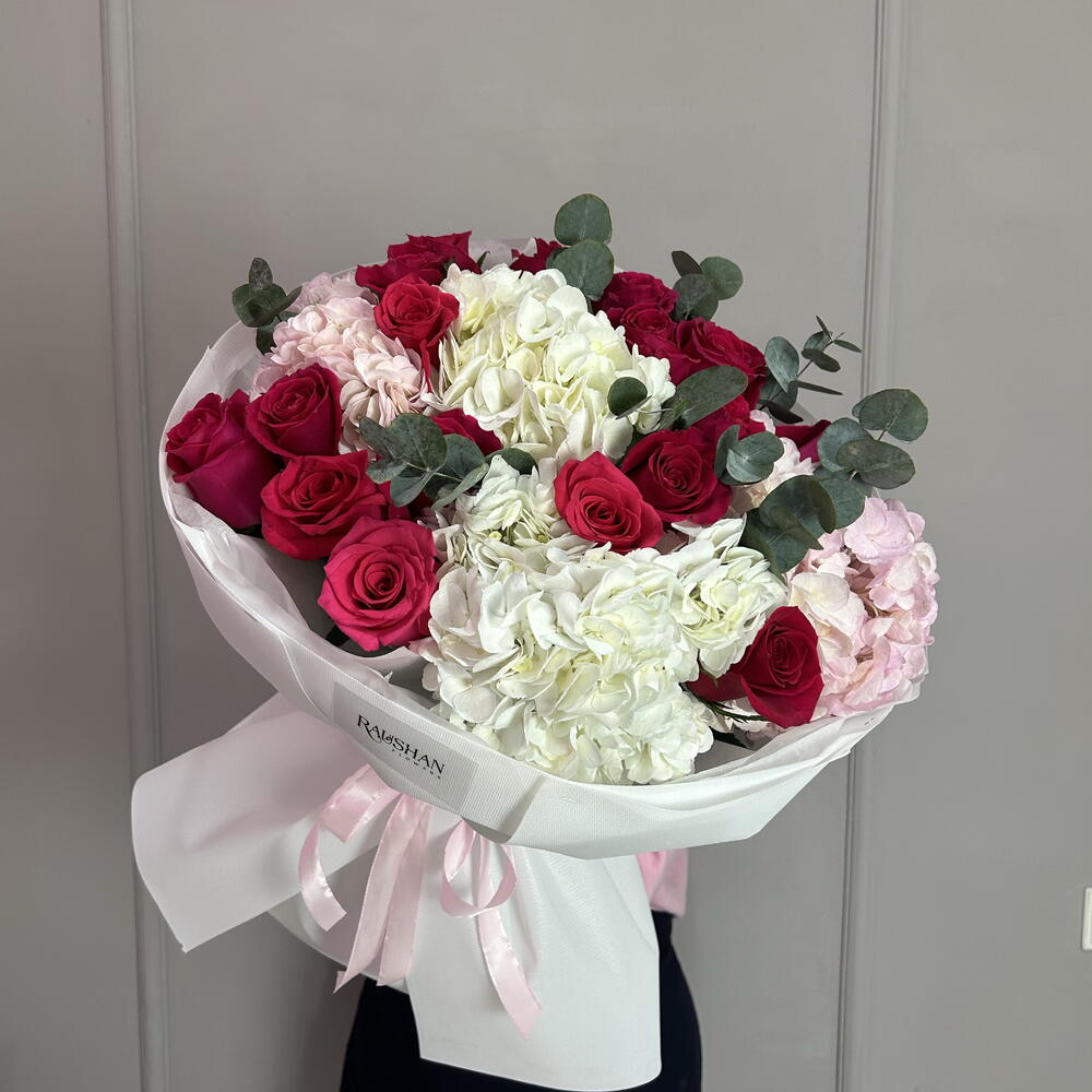 Гортензия - 7 шт. Эвкалипт Микс - 1 шт. розы - 17 шт.