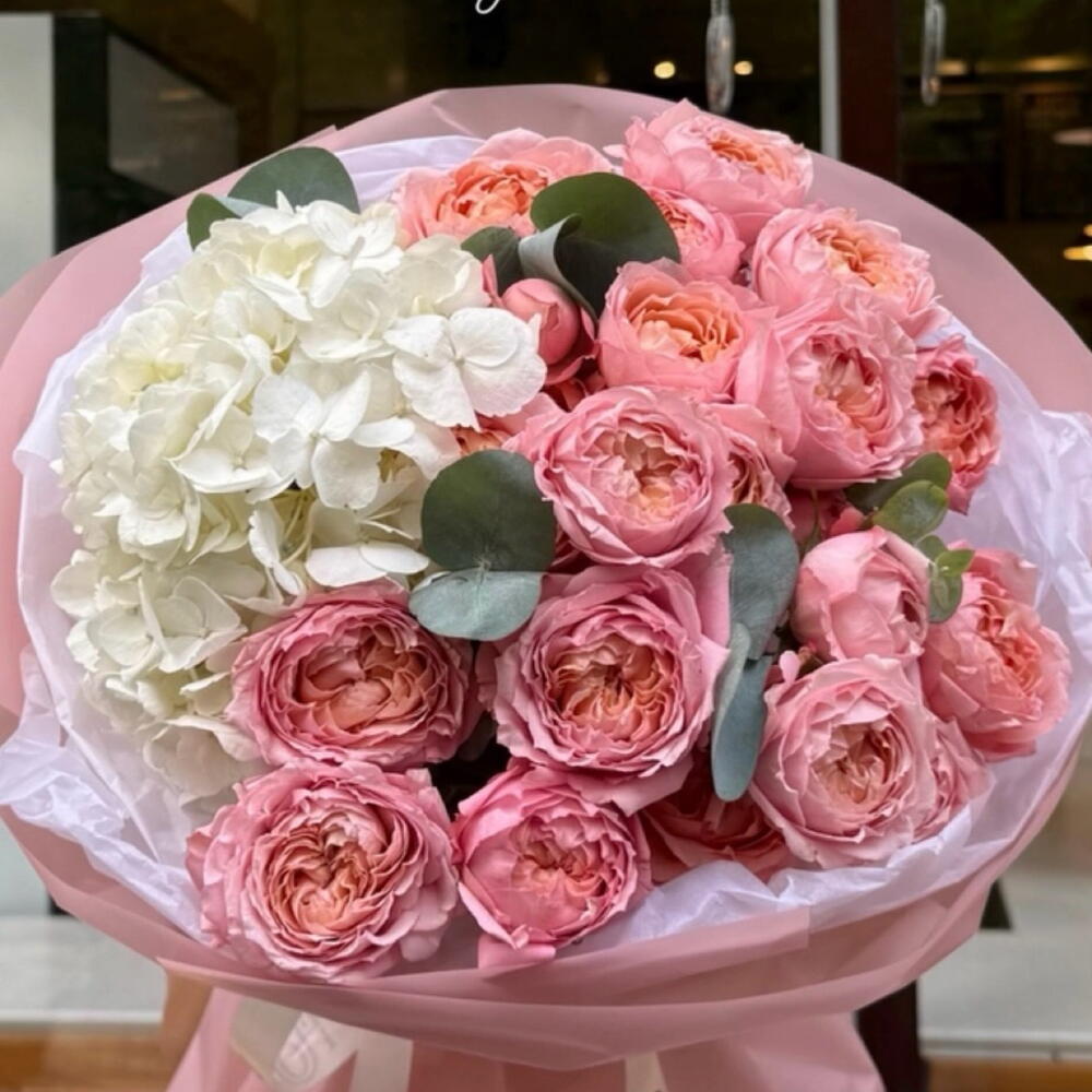 Гортензия - 1 шт. Упаковка дизайнерская - 3 шт. Открыточка с вашими пожеланиями - 1 шт. Эвкалипт Цинерея - 3 шт. джульетта роза пионовидная - 5 шт. инструкция по уходу за цветами - 1 шт. витамины для цветов (кризал) - 1 шт.