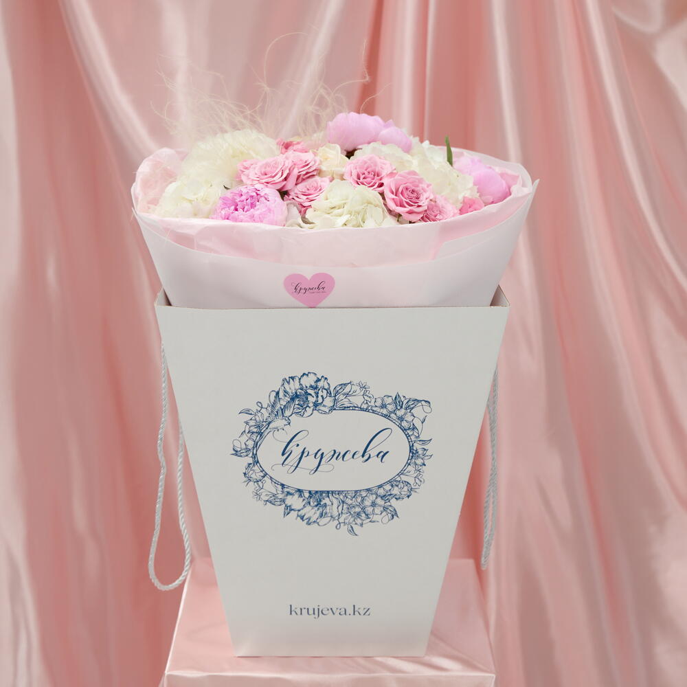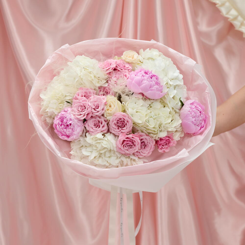 Гортензия - 4 шт. Кустовая роза - 3 шт. Упаковка - 1 шт. Пион Розовый - 3 шт. Стифа - 1 шт. white o'hara - 2 шт.