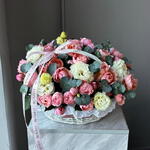 Эустома - 6 шт. Корзина плетеная - 1 шт. Спрей роза - 11 шт.