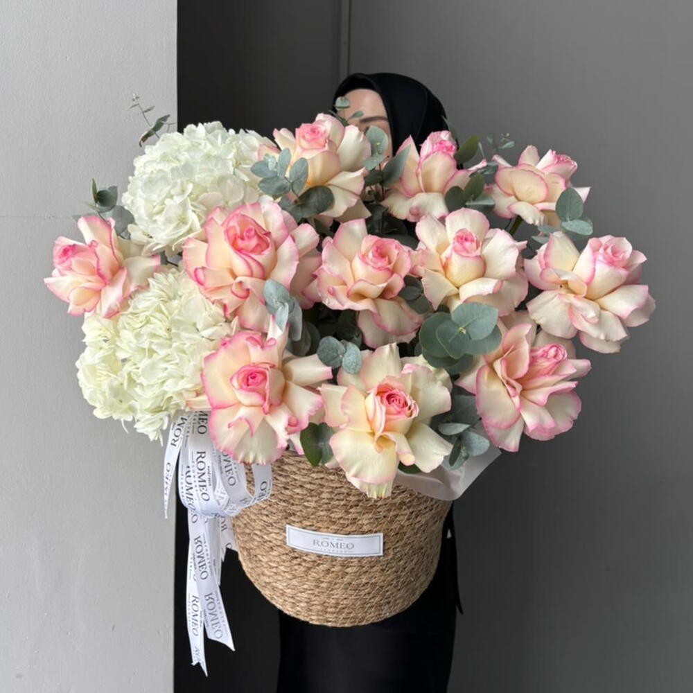 Гортензия - 2 шт. Роза одноголовая - 11 шт. Кашпо - 1 шт.