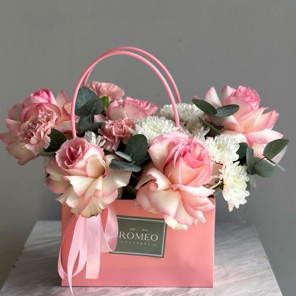 Хризантема кустовая - 1 шт. Роза одноголовая - 5 шт. Гвоздика - 3 шт.
