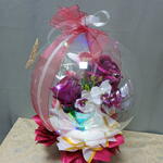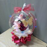 Искусственные розы, качественно имитирующие живые, в шаре баблс. Букет украшен флористической бумагой и плёнкой в форме крыльев бабочки, дополнен светодиодной подсветкой. По желанию заказчика на шар можно сделать наклейку с вашим текстом.
