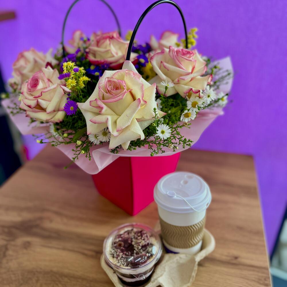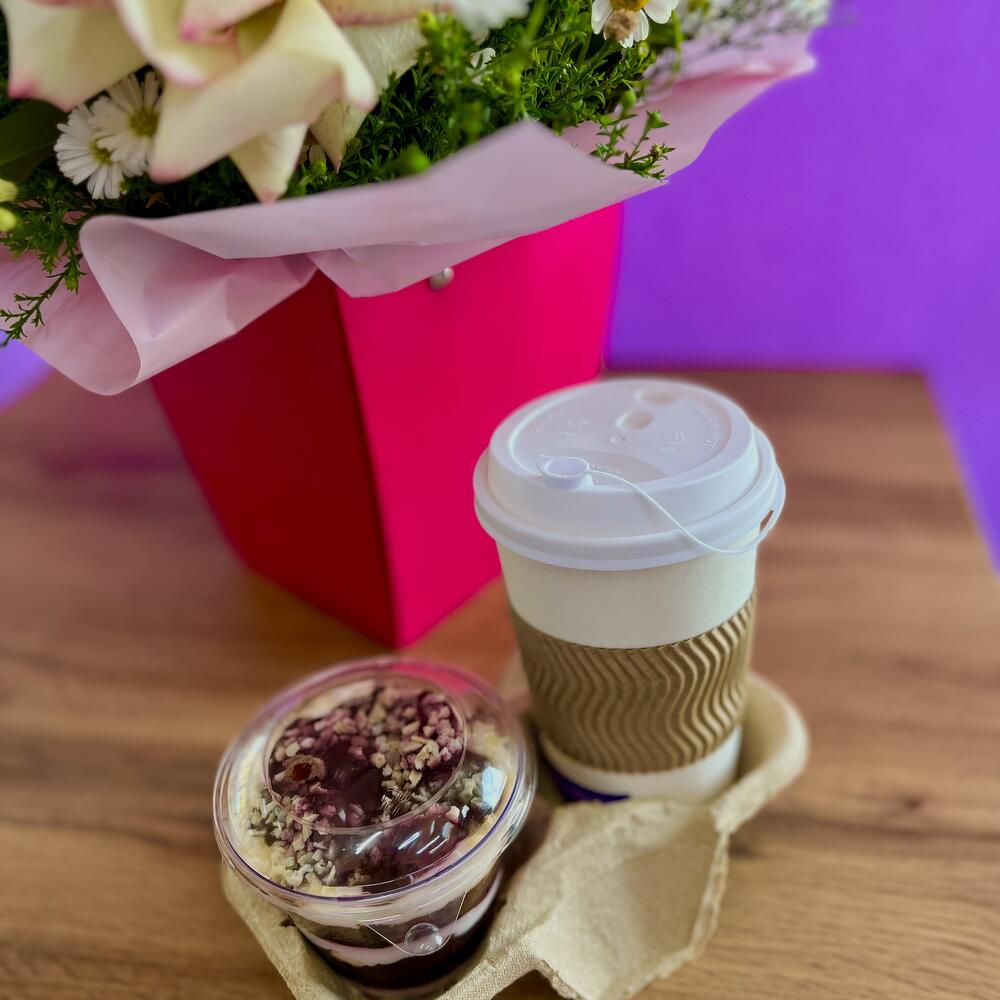 Набор из ароматного стакана кофе, нежного трайфла и букета свежих цветов — стильный подарок для души. Капучино подарит бодрость, трайфл c тирамисунаполнит момент сладостью, а цветы создадут атмосферу радости и уюта.