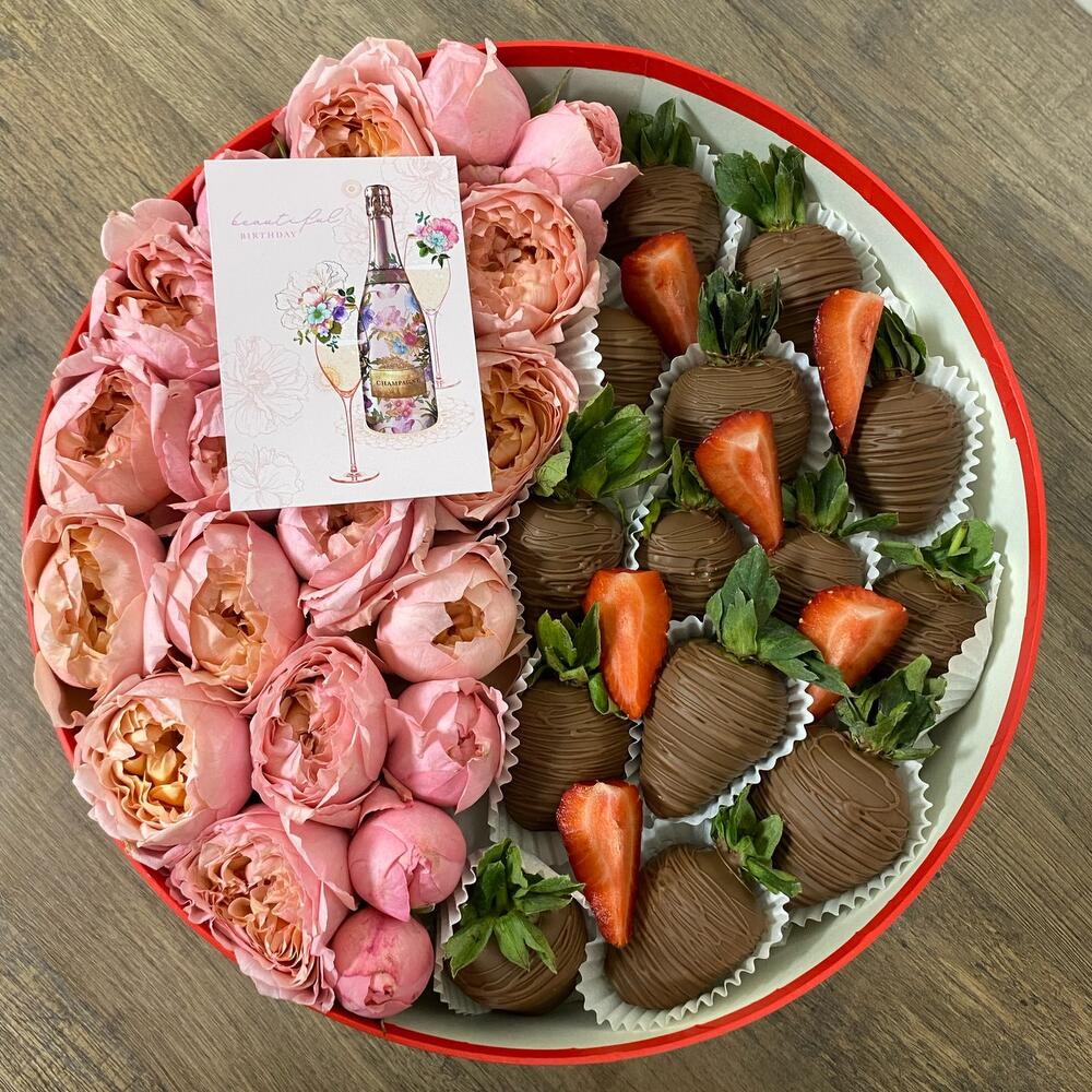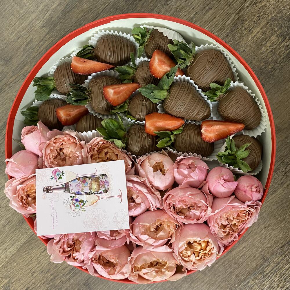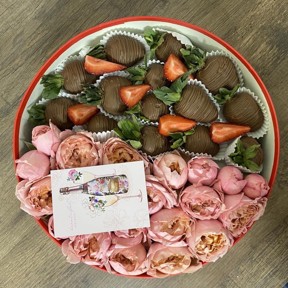 Клубника в шоколаде - 13 шт. джульетта роза пионовидная - 5 шт.
